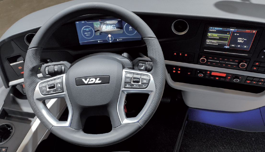 Il posto guida presenta un cruscotto interamente ridisegnato, per quanto ricordi molto quello precedente, forse anche per la scelta, molto classica, dei colori. I comandi sono elegantemente distribuiti sui due lati, più il pannello laterale, mantenendo un’ottima ergonomia complessiva. Sulla destra, dove sono distribuiti gran parte dei comandi per la zona passeggeri, inclusa la centralina per la climatizzazione, è montato il sistema multimedia Bosch Coach, con prese aux di tipo Usb-A e Hdmi. Al centro invece spicca il nuovo display digitale a colori che può incorporare le immagini provenienti dalla porta posteriore o dalla retrocamera, oltre ad ospitare le segnalazioni dei dispositivi Adas e quelle più tradizionali relative a velocità, numero di giri, livello carburante, ecc. Particolarmente ricco di comandi il volante, che permette di gestire gran parte delle funzionalità dell’infotainment senza distogliere l’attenzione dalla guida. Pratiche anche le due appendici per la regolazione a sinistra dei tergicristalli e a destra del retarder. L’autista può inoltre contare su una maggiore sicurezza in caso di incidente, con una struttura frontale aggiuntiva per la sua incolumità dopo un tamponamento e con un sistema di protezione anti-incastro per le autovetture. Il sistema di climatizzazione è denominato Vdl Extreme ed è costituito da un gruppo a tetto Eberspächer Ac136 da 39 kW in raffeddamento, e un compressore Bitzer 4Nfc-Y, più un frontbox autista, anch’esso di Eberspächer. La diffusione dell’aria climatizzata avviene dalle feritoie a lato delle cappelliere (verso il centro del padiglione e verso i finestrini) e dalle bocchette individuali. Il riscaldamento è anche a parete mediante termoconvettori ed è supportato da un bruciatore ausiliario Valeo Thermo plus 300 da 30 kW con possibilità di programmazione dell’accensione (timer). Sotto al piano di calpestio, che come da tradizione Vdl è privo di podesti laterali (a beneficio della pulibilità e dell’accesso alle cappelliere), la bagagliera passante è di oltre undici metri cubi, incluso lo spazio per l’eventuale cuccetta autista, ricavata subito dietro la porta posteriore. Gli sportelli presentano un movimento di apertura parallela (a pantografo) e hanno il sistema di sblocco centralizzato dal posto guida o dal telecomando.