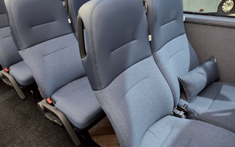 Le migliorie di carrozzeria dovrebbero contribuire a una significativa riduzione dei consumi di carburante, che Vdl stima fino al 15 per cento in meno rispetto alla gamma precedente. Anche questo in funzione di un valore di Tco più basso, da sempre oggetto di attenzione del costruttore olandese. Per il resto la linea rimane abbastanza classica ed elegante, dove è chiara la parentela con l’Fhd2, segno che un design pulito e non troppo spinto ci mette più tempo a passare di moda; un altro elemento della concretezza nord europea. Anche gli interni beneficiano di un rinnovo pressoché completo, visibile soprattutto nelle cappelliere dove i gruppi di cortesia (comprendenti spot individuali, bocchette aria, altoparlante, pulsante di chiamata) sono incorniciati da una plafoniera che svolge anche il compito di illuminare l’abitacolo di notte, mediante luce blu. La selleria è la Vdl Class 300 realizzata da Vogel/Brusa: non molto appariscente (almeno nei colori scelti per il veicolo portato a Bruxelles) ma piuttosto confortevole. Ogni biposto ha a disposizione una doppia presa Usb (tipo A+C) posizionata al centro e un bracciolo abbattibile, più l’allargabilità per il sedile lato corridoio. Inoltre, sul retro è presente una luce led blu, quasi ad incorniciare la zona dell’eventuale tavolino. Nella configurazione di allestimento vista al Busworld i posti erano 53 + 1 + 1, ma sul tredici metri possono essere fino a 59.