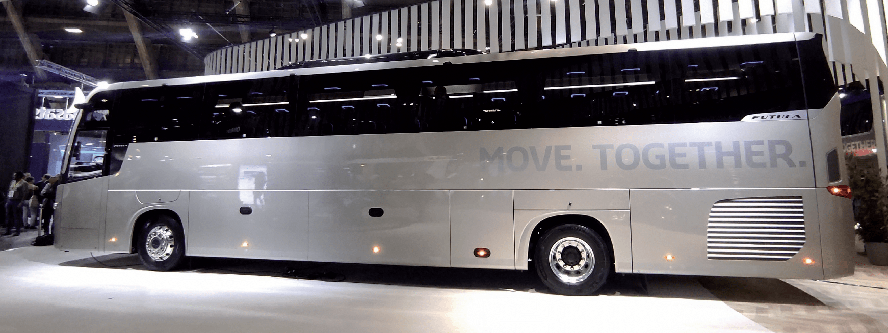 Ma torniamo sull’autobus esposto a Bruxelles. Il turistico Fhd3-129 è lungo 12.885 millimetri, un centimetro più del modello precedente, dal quale differisce per pochi mm anche nell’altezza e nel passo. Un veicolo, quindi, che pur strutturalmente derivato almeno in parte dall’Fhd2 (e quindi dal Magiq) ha beneficiato di numerosi interventi. Tra i più importanti, oltre alla zona motore, va segnalato il piccolo allungamento dello sbalzo anteriore, al fine di rendere più filante il frontale, migliorando il coefficiente aerodinamico. Il parabrezza risulta così leggermente più inclinato ed avvolgente del precedente, integrato da una calandra anteriore dove spiccano i nuovi gruppi ottici a led, la cui copertura trasparente si raccorda alle fiancate con una piccola aletta, anch’essa con funzioni aerodinamiche, oltre che estetiche. Completa l’ottimizzazione del cx la caratteristica ondulazione della testata posteriore, già presente a partire dal Magiq, ma qui molto più spigolosa e accattivante.
