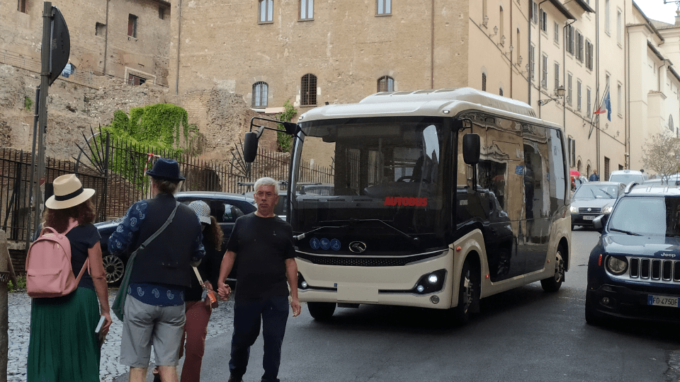 Il Pev6 sfiora i sei metri di lunghezza, fermandosi a 5.990 millimetri. La larghezza è di 2.065 mm, mentre l’altezza di 2.820. Sbalzi? Anteriore di 900 millimetri, posteriore di 830. Il passo, invece, è di 4.260. Il raggio cerchio di sterzata di 8 metri circa, come già detto, permette al minibus elettrico di King Long di destreggiarsi nel traffico e nei vicoli più stretti: a Trastevere (ma non solo), per esempio, non è stato un problema percorrere alcune viuzze solitamente ostili ai mezzi che trasportano persone. A muovere il Pev6 è il motore centrale fatto in casa EP6 E-drive Axle con potenza continua di 60 kW e massima di 135 kW. La coppia è di 350 Nm. Le batterie sono Lfp con capacità di 89 kWh. L’assale anteriore è firmato Dongfeng, mentre quello posteriore è EP6 E-drive Axle, appunto. Le sospensioni sono ad aria, mentre il sistema frenante porta la firma di una certezza come Wabco. Lo sterzo è Bosch. Nella nostra scampagnata, su e giù per Roma, si nota un notevole spunto in salita, come quella che per esempio ci ha portato al Belvedere del Gianicolo.