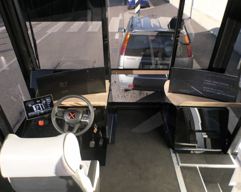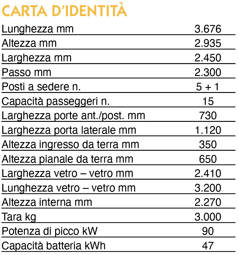 Venendo alle specifiche tecniche, il veicolo presenta trazione full electric con potenza di picco di 90 kW. La batteria a ioni di litio lavora a 400 Volt e garantisce un accumulo di massimo 47 kWh. Ma «il modello successivo avrà circa il doppio della capacità », garantisce Gecchelin. A bordo ci sono cinque sedute passeggeri, a cui si aggiunge spazio libero in grado di ospitare, nel rispetto delle masse ammesse, fino a dieci ulteriori passeggeri in piedi, per una capacità totale di 15 effettivi oltre l’autista.