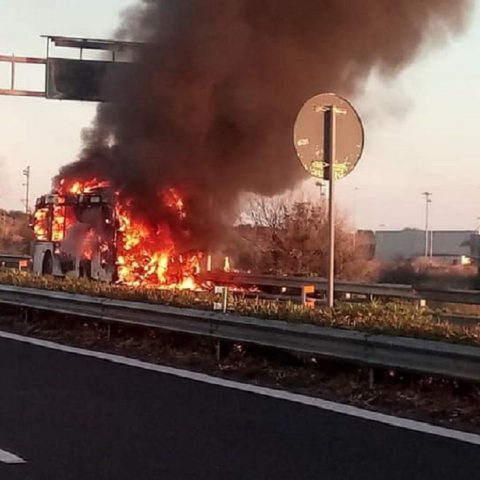 Pullman in fiamme in autostrada. Passeggeri illesi