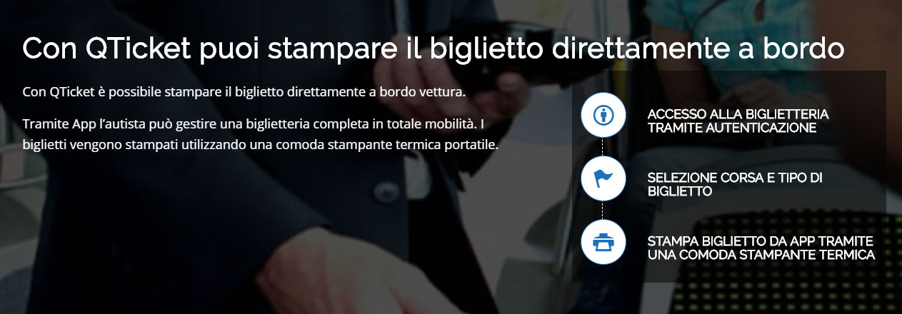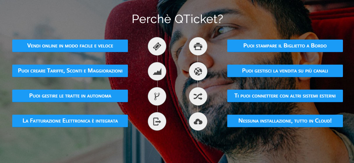 Qticket rappresenta la nuova generazione delle piattaforme di gestione della vendita on line di biglietti per autobus, treni e traghetti. Una piattaforma che fa della velocità e della facilità d’uso la sua cifra essenziale. Si adatta alle esigenze più specifiche e non comporta ulteriori investimenti in hardware e gestione sistemistica.