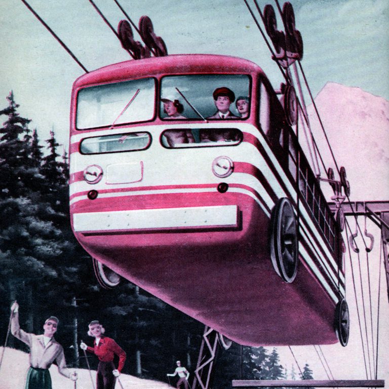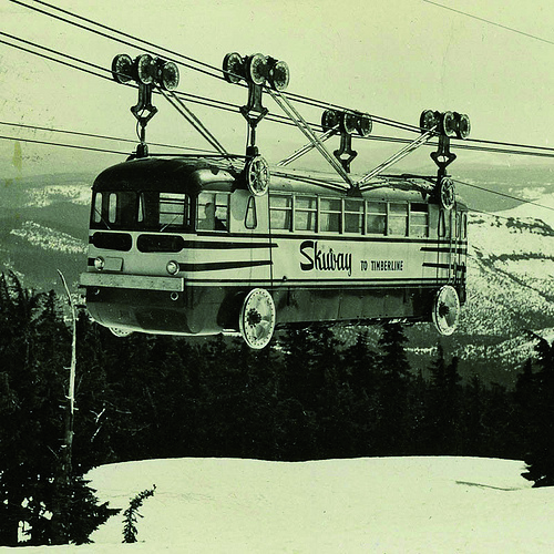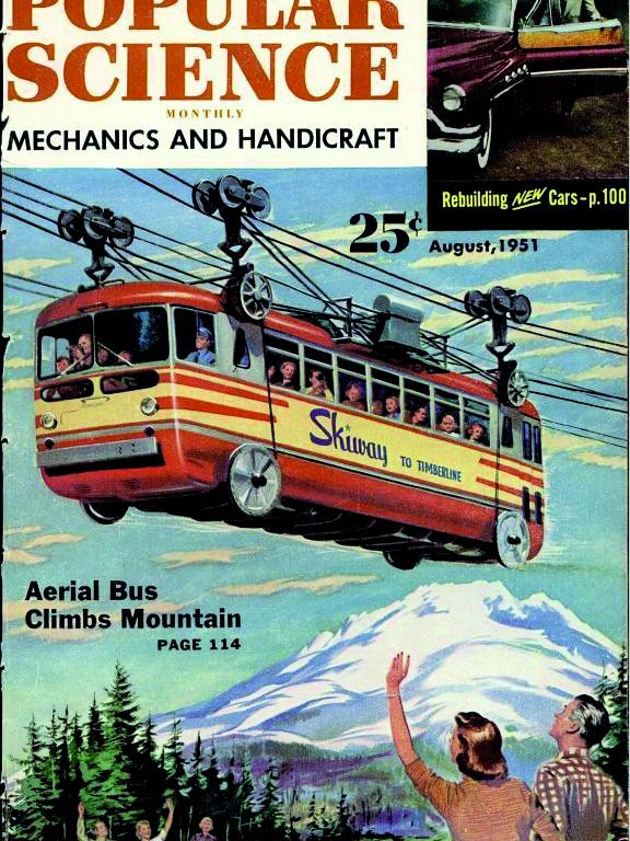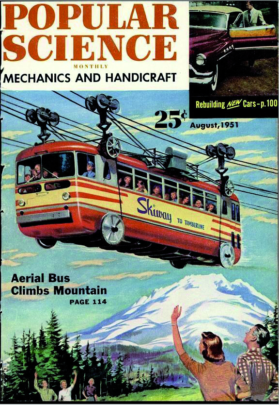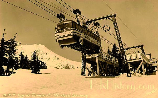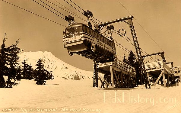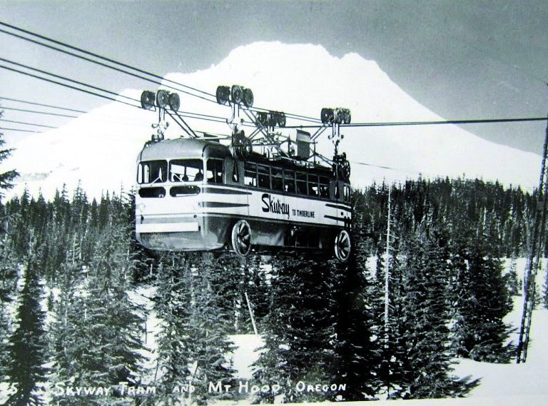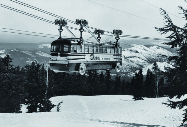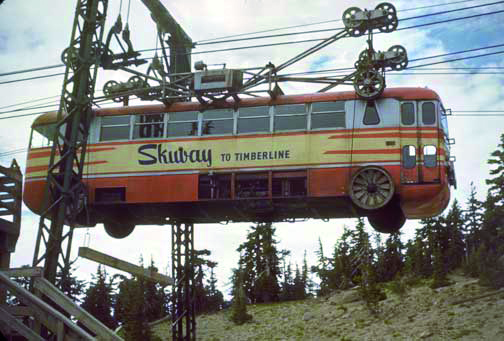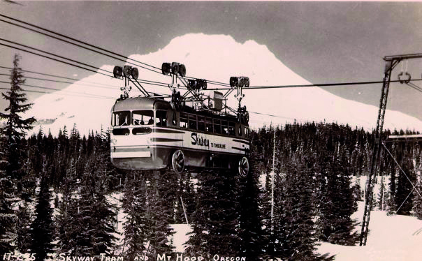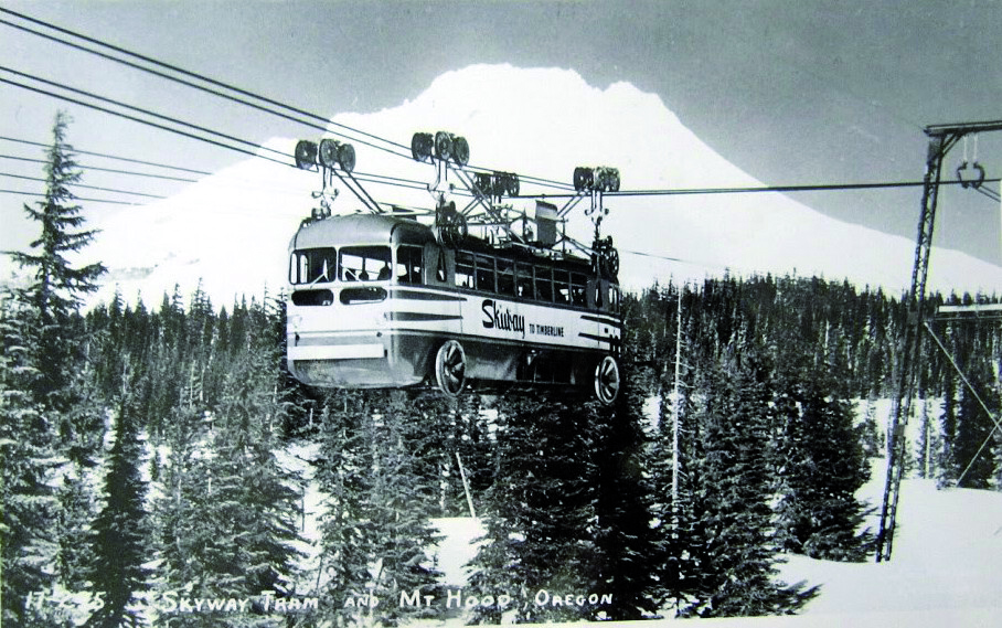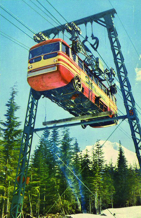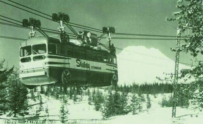 Quanti ricordano il film “Shining” con Jack Nicholson? Probabilmente molti. Pochi però sanno che l’Overlook Hotel, dove si svolge la storia, è in realtà il Timberline Lodge sul Monte Hood, nota località sciistica dell’Oregon. Nel 1937, anno della sua costruzione, vi era un’unica tortuosa strada forestale, spesso interrotta per neve. Il crescente interesse per lo sci richiedeva una soluzione alternativa. Nel 1946 lo sciatore W.D.B. Dadson, assieme al medico Otto George, fondò la società Mount Hood Aerial Transportation Company senza però avere chiare idee su cosa fare, anche perché la tecnica per gli impianti di risalita era ancora agli inizi. Myrl Hoover, proprietario di una piccola azienda di autobus, suggerì di modificare dei veicoli stradali per viaggiare sospesi a funi di acciaio. Coinvolsero così un costruttore di attrezzature per boscaioli, la Pointer-Willamette, per modificare due autobus Kenworth e per adattare al servizio “passeggeri” ganci, sospensioni, pulegge normalmente usate per le teleferiche merci. L’entusiasmo per l’iniziativa, anche attraverso una martellante pubblicità su alcune riviste sportive e turistiche, convinse 425 privati sciatori ad acquistare azioni della società che avrebbe di lì a poco realizzato la più lunga funivia del mondo. Qualcuno la definì la “Chitty Chitty Bang Bang delle montagne”, altri usarono il termine “cloudliner”.
