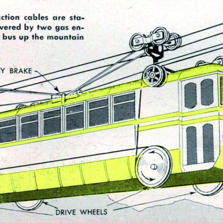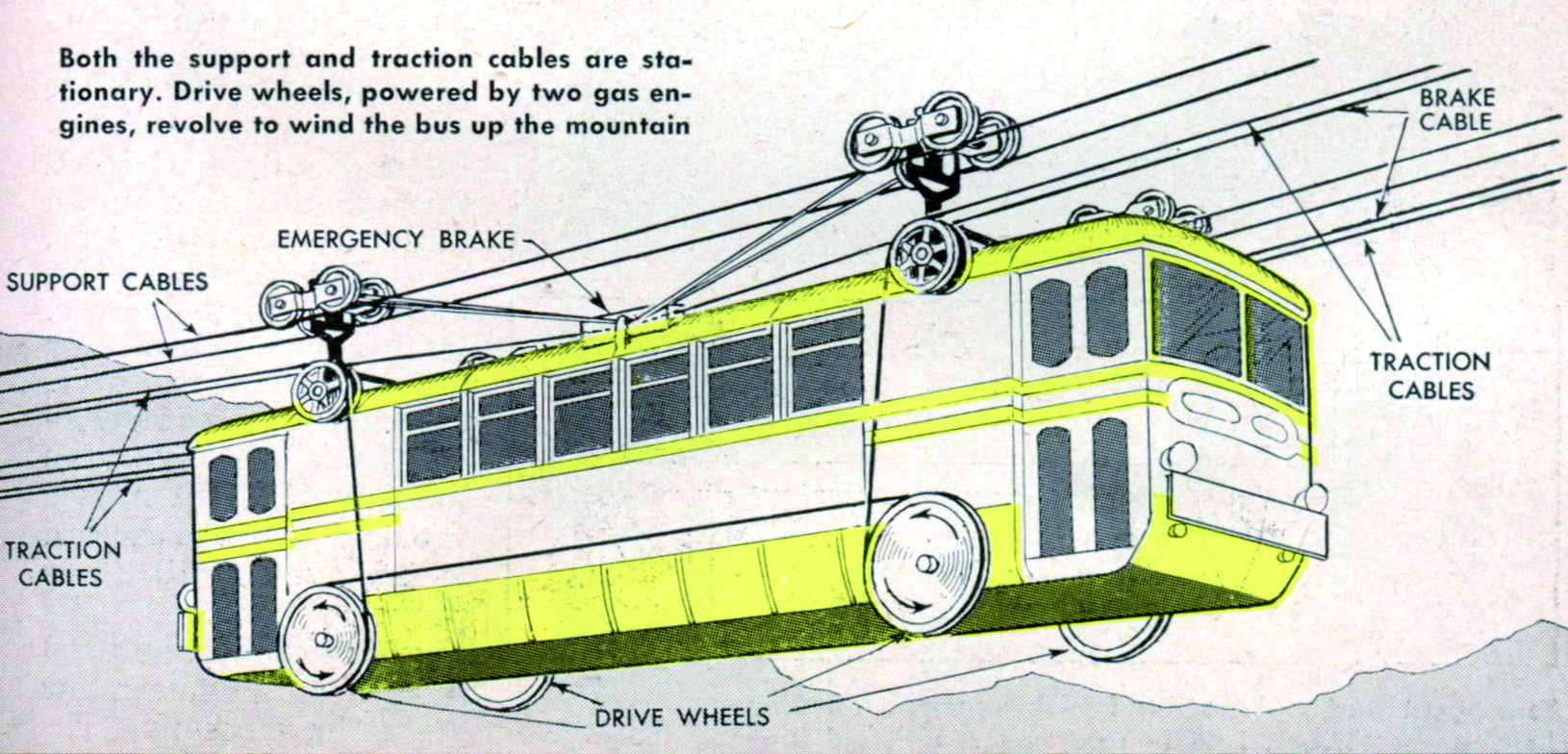 I due posti guida rimanevano pressoché uguali all’originale, eccetto per l’assenza del volante, ma con tanto di acceleratore, freno, frizione e leva del cambio. I 36 sedili passeggeri erano dotati di schienale ribaltabile in modo da poter essere rivolti sempre “fronte marcia” a prescindere dalla direzione del veicolo. Il tempo di percorrenza era di oltre 20 minuti, ma essendo una linea singola era necessario riportare a valle il veicolo prima di poter effettuare una nuova risalita. Per ovviare in qualche modo a questo limite era stato predisposto un secondo veicolo da usare soltanto come “bis”, dietro al primo autobus. Lo Skiway ebbe comunque vita breve: alti costi di gestione, costo del biglietto superiore a quello del bus stradale (75 cents contro 50), formazione di ghiaccio lungo le funi, capacità passeggeri limitata, portarono alla sospensione del servizio già nel 1956 ed alla demolizione dell’intera linea nel 1961. Oggi rimangono alcune basi in cemento dei piloni e la stazione di partenza: quest’ultima funziona ancora come ristorante ed ospita un piccolo museo sulla storia della zona, con una sezione dedicata a quello che è probabilmente il più strano mezzo di trasporto di sempre. Giovanni Tosi