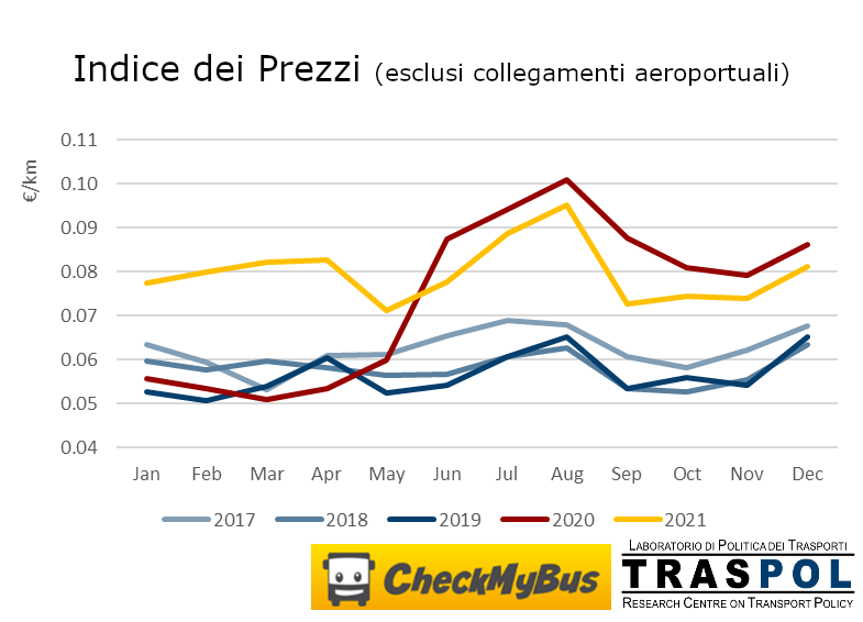 Il prezzo medio dei biglietti nel 2020 è andato totalmente in controtendenza con quanto avveniva negli anni precedenti: dopo una costante diminuzione che durava da anni, le restrizioni e il numero ridotto di corse del 2020 hanno obbligato le compagnie d’autobus ad alzare significativamente il costo del servizio per contenere le perdite subite.