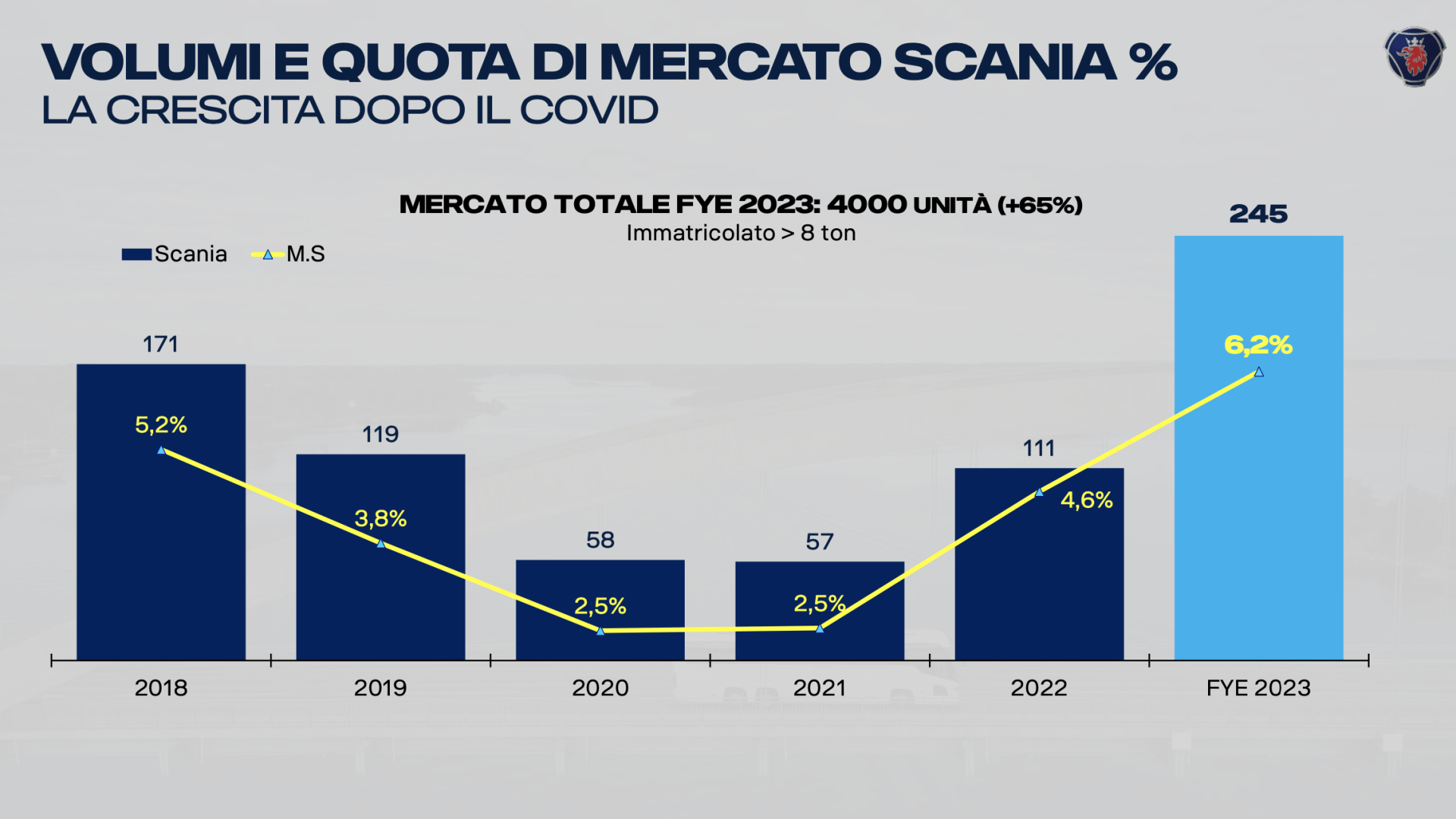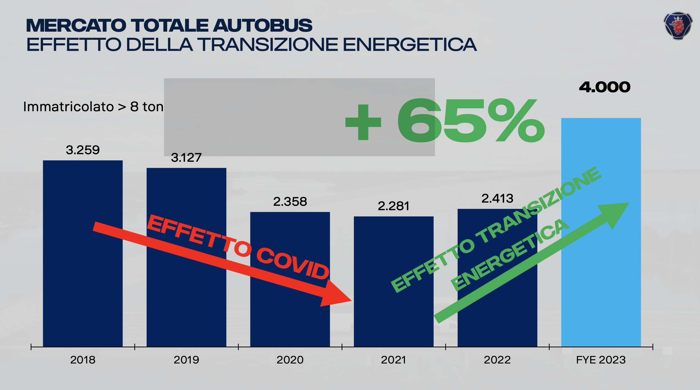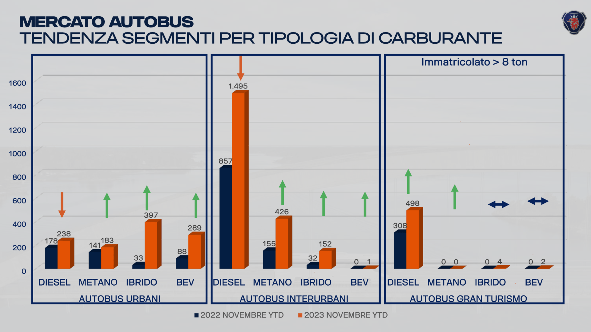 Nel corso della tradizionale conferenza stampa di fine anno del Grifone, quest’anno organizzata nella tanto splendida quanto iconica location di Terrazza Martini, nel cuore di Milano, Roberto Caldini, direttore divisione bus&coach di Scania Italia ha dato i numeri – positivi – del comparto di cui è al timone per il mercato tricolore: nel corso del 2023 Scania ha immatricolato 245 veicoli, più che raddoppiate le targhe messe a segno nel 2022 (111), per una soddisfacente quota di mercato del 6,2%.