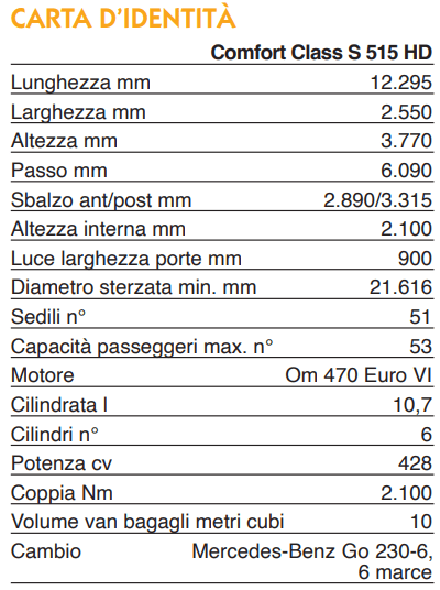 12.295 millimetri di lunghezza, l’S 515 Hd può ospitare un massimo di 53 passeggeri. Nulla di nuovo sotto il portellone posteriore: il motore per tutti e sei i modelli della ComfortClass, è il più che rodato Om 470 Euro VI da 394 (solo per il ‘corto’), 428 o 456 cavalli (quest’ultima è la taratura del veicolo presentato in queste pagine), fino ai 476 dell’Om471 disponibile sui modelli a tre assi, e unica scelta per il terzetto TopClass (476 o 510 cavalli).
