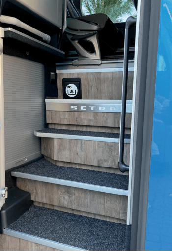 Tornando all’Active drive assist, questi sfrutta le funzionalità di Adaptive cruise control, Lane assist e Aba 5 e i rispettivi sensori radar e telecamere per mantenersi in corsia e aggiustare la distanza di sicurezza. Il quattro razze è governato dal motore elettrico integrato al volante che prende il nome di Active steering assist (identificato, quando in funzione, dal simbolo verde del volante sul quadro luci). L’Active drive assist 2 può essere disattivato lasciando in funzione cruise control adattivo e Pcc. Quando il sistema non ‘vede’ più una o entrambe le linee di demarcazione della corsia, compare un segnale visivo sul quadro luci, unitamente a una vibrazione del sedile. Lecito pensare che il conducente, a segnaletica orizzontale fresca, possa rischiare di rilassarsi. Entra qui in gioco il sistema che ne monitora la presa sul volante: una tecnologia, ‘affogata’ nel meccanismo di sterzata idraulico, che controlla in tempo reale, costantemente, la forza e l’intensità della presa, in modo da percepire i segni di un colpo di sonno o di un malore. A cui segue quella che in Setra definiscono ‘cascata’ di segnali volti a riportare al timone il conducente. È sufficiente imprimere un piccolo colpo al volante per comunicare al sistema che si è di nuovo al comando. Passati sessanta secondi senza risposte agli alert, si mette in moto la funzione Emergency stop, sulla quale campeggia un ulteriore bollino ‘new’. In poche parole: il software del veicolo attiva le quattro frecce e avvia una frenata progressiva del bus fino ad arrestarlo, il tutto senza derogare – laddove possibile – al rispetto della posizione in corsia. Inutile dire che il driver può fermare il processo in qualsiasi momento. Le prossime novità, nel mondo Setra, arriveranno nel medio termine dalla gamma Le Multiclass.