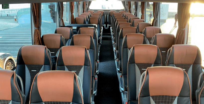 Incrementati gli inserti di colore nero. Le paretine dietro il sedile conducente e hostess sono ora in vetro nero opaco e recano, di nuovo, ben visibile il logo Setra: una scelta di design volta a improntare la vista frontale dell’autobus a una sensazione di continuità cromatica e di richiami estetici con il brand ospitato al centro della calandra. Belli i nuovi service set: incorniciati da una piattaforma di luce tenue, offrono bocchettoni dell’aria ora tondi e direzionabili a 360 gradi. Consueta eleganza per gli interni, con sedili dotati di tavolino, portabibita, retina portaoggetti, maniglie. Uno sguardo al posto guida. L’accensione del veicolo avviene in modalità ‘keyless’. Immutato il feeling Setra, sul quale c’è veramente poco da dibattere. La sostanza è la stessa. A sinistra la consolle per il freno di stazionamento elettronico (la funzione ‘hold’ si attiva automaticamente premendo con vigore sul pedale del freno a veicolo fermo).
