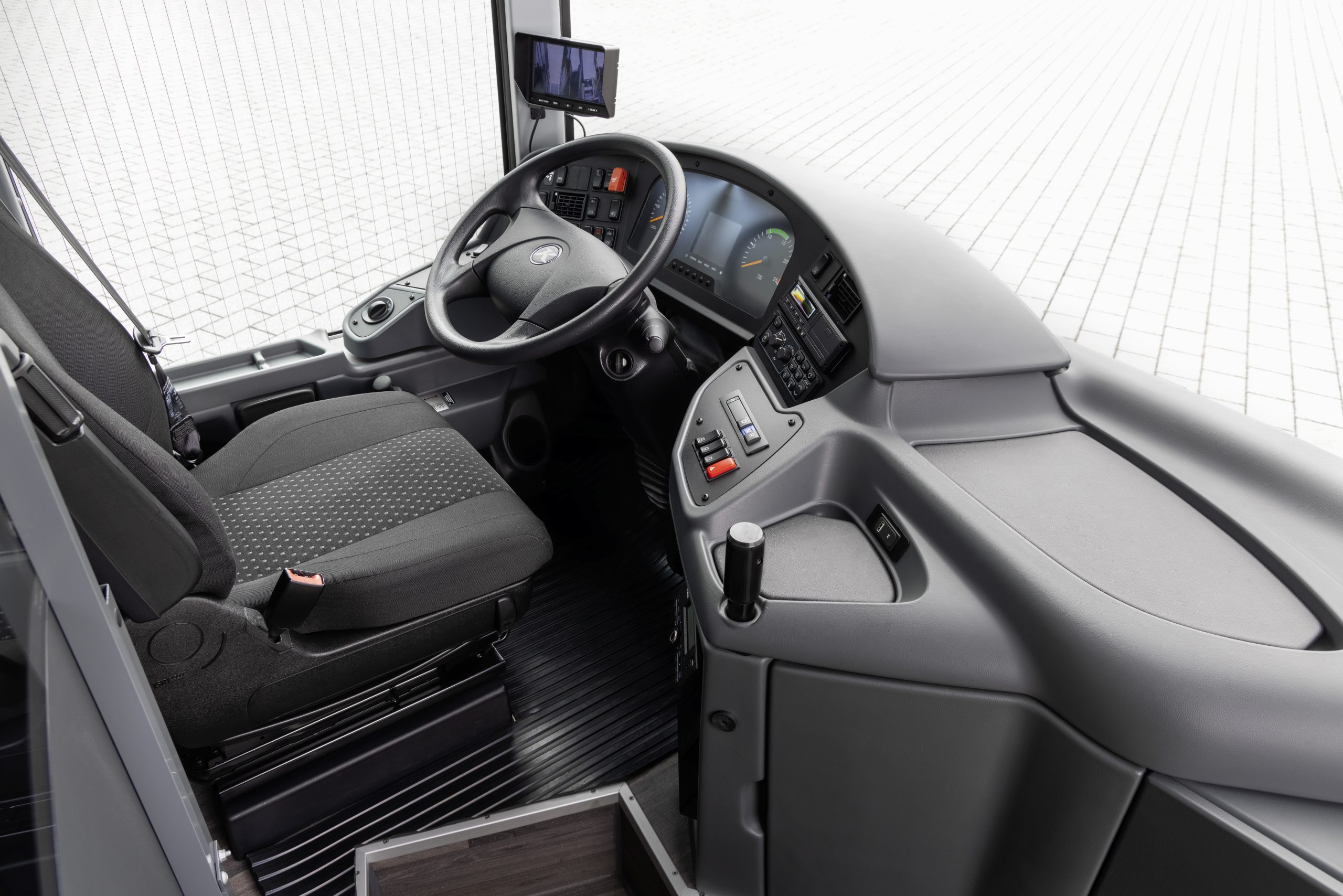 Il posto guida è posizionato ad un’altezza dal suolo di 860 millimetri, proprio come un normal floor, in modo da conservare l’ottimo campo visivo dei ‘vecchi’ Ul e da assicurare maggiore sicurezza in caso di impatto frontale. Il cruscotto prevede la classica impostazione avvolgente della serie Multiclass, dove ogni dispositivo è facilmente raggiungibile, mantenendo la possibilità di personalizzare almeno in parte le posizioni dei comandi. Il display centrale a colori fornisce costantemente le informazioni sulle funzioni attivate e su eventuali criticità del mezzo. Sui due lati, infine, vi sono due bocchette aria regolabili, per la climatizzazione separata del conducente. Quasi superfluo dire che al volante ci si sente subito a proprio agio, facendoci illudere di guidare un pullman da turismo. Completa l’abitacolo, la separazione del posto autista con una paretina posteriore alta ed un cancelletto laterale che, a scelta, può essere di tipo basso o dotato di vetratura verso il parabrezza.
