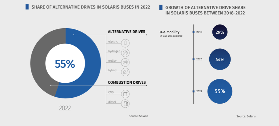 E il portafoglio ordini? Al 31 dicembre 2022, il portafoglio ordini comprendeva 1369 veicoli e 1648 unità . Nel 2022 Solaris dichiara di aver consegnato in totale 401 unità di autobus elettrici a batteria. Questa cifra è diversa da quella fornita da CME Chatrou Solutions nel suo rapporto annuale sul mercato degli autobus elettrici in Europa; si potrebbe ipotizzare che i filobus a batteria (Trollino) siano conteggiati insieme agli autobus (i dati di CME Solutions non considerano i carrelli). Solaris ha venduto 42 autobus a idrogeno nel 2022.
