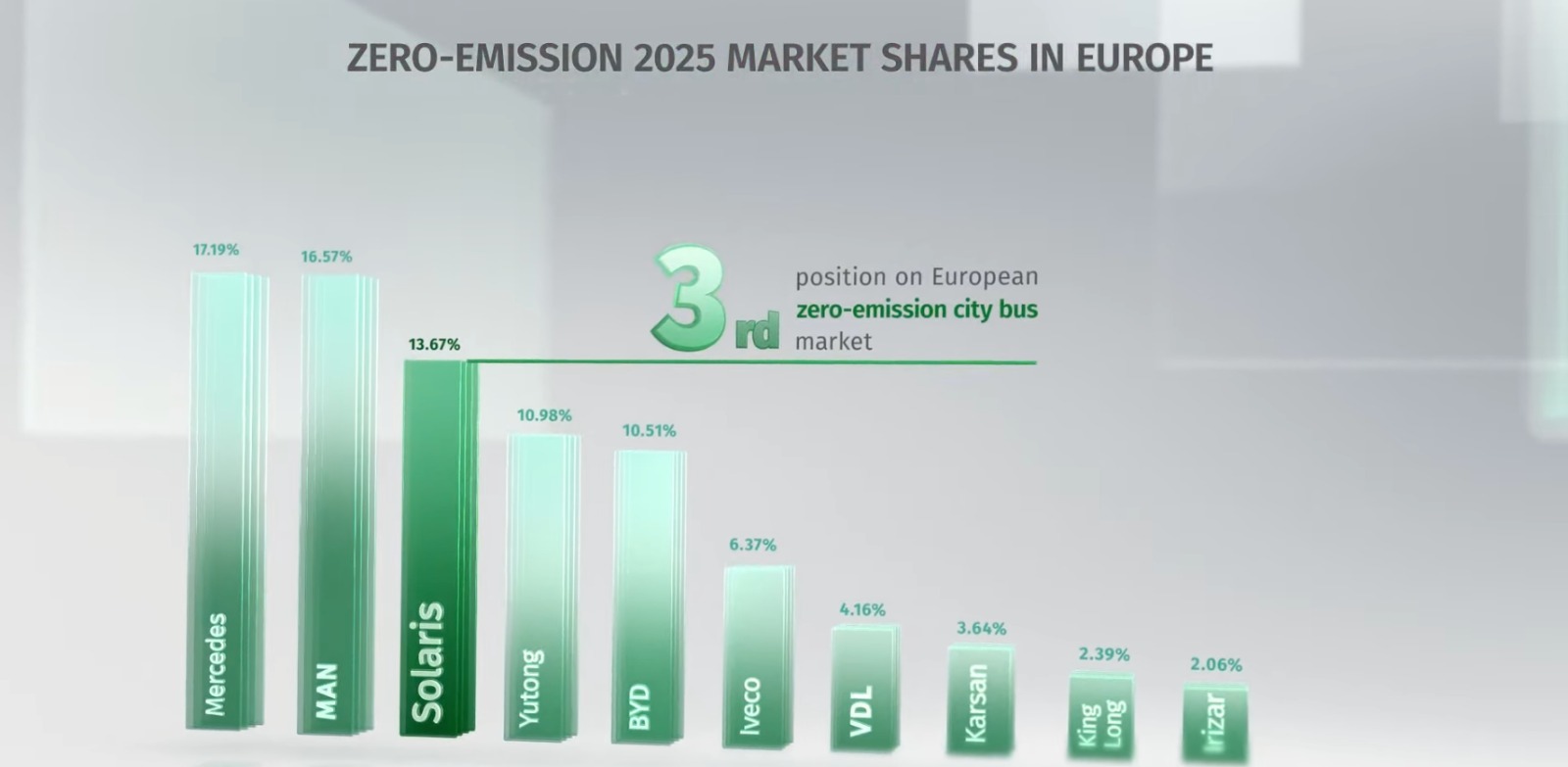 Venendo ai risultati ottenuti da Solaris nel corso del 2025, le consegne di autobus e filobus sono aumentate del 7% su base annua, toccando quota 1.631 unità. Boom per gli ordini: registrati 2.780 contratti, +114% sul 2024. Secondo quanto riportato da Agata Standa, l’86% delle consegne effettuate ha coinvolto veicoli a zero e bass emissioni, dunque elettrici, fuel cell e gas (+3% sul volume delle trazioni alternative nel 2024).