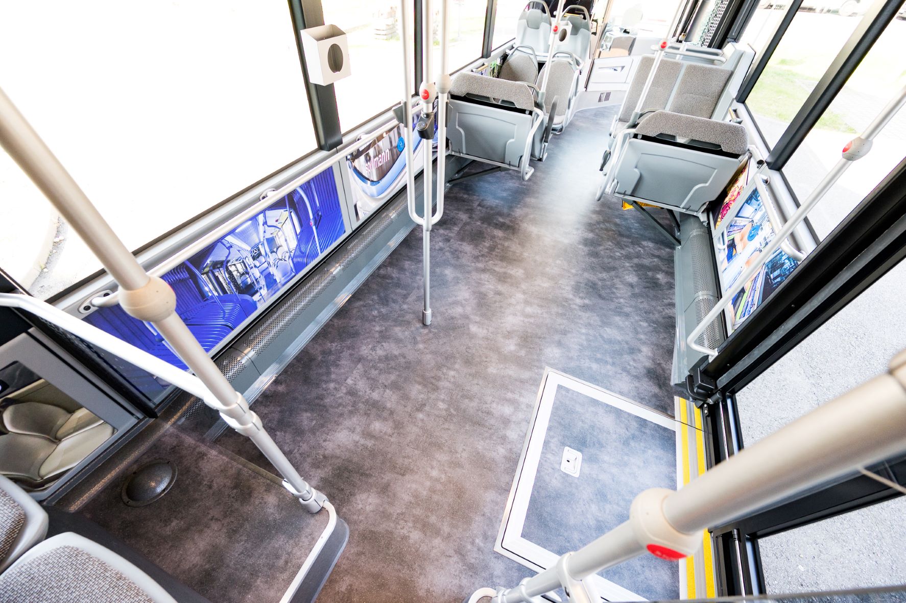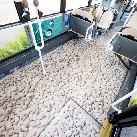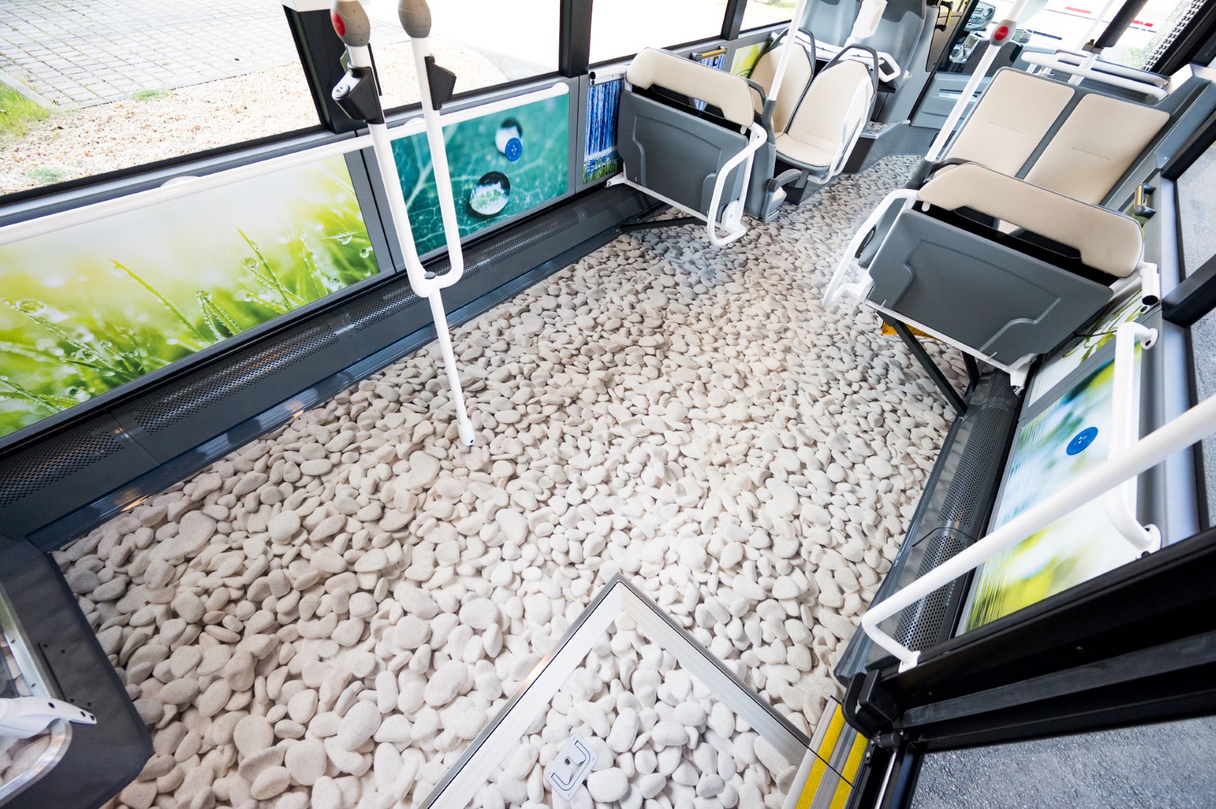 L’esterno del Citaro ibrido presenta le caratteristiche tipiche del design Spillmann: vernice argento brillante con strisce blu a contrasto e il pacchetto Metrodesign, che fa apparire la sezione frontale e la linea laterale simili a quelle di un treno. Nel “World of Public Tansportation” le pareti laterali sono stampate individualmente con i popolari concetti di traffico, quindi il rivestimento del pavimento ha un look stradale vintage; inoltre è presente un gran numero di stazioni di ricarica USB sulle maniglie e sulle file di sedili, nonché i proiettori a soffitto basati su LED, il cui colore di luce può essere variato.