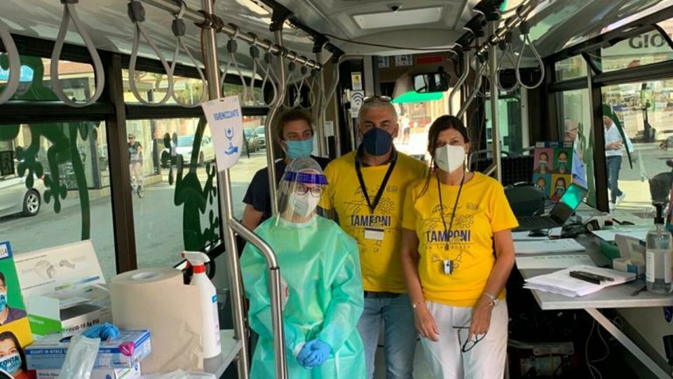 Un autobus di Atvo per fare i tamponi in spiaggia