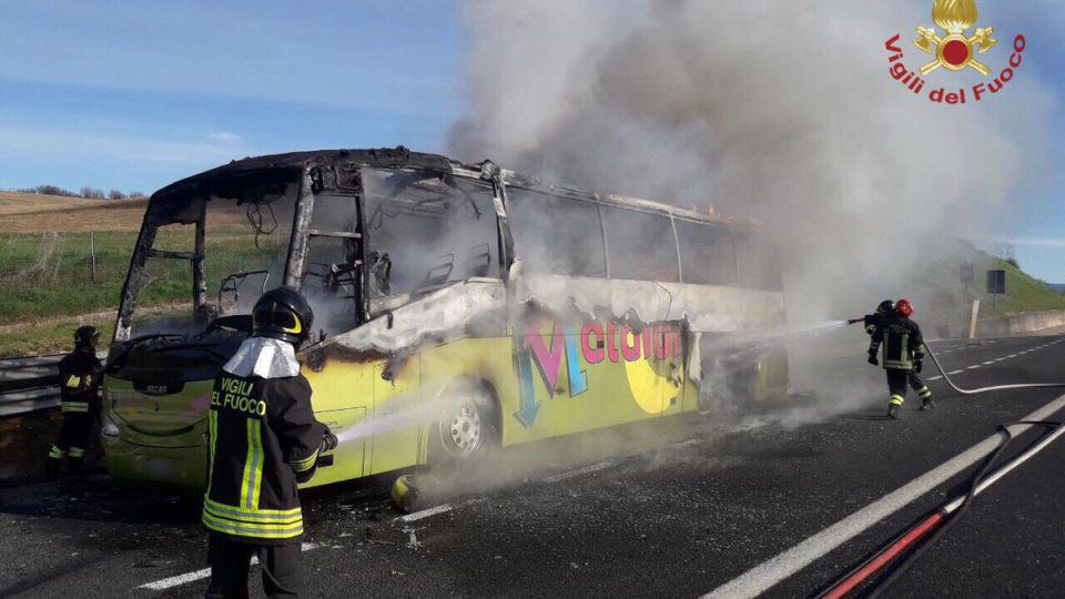 Autobus di studenti prende fuoco sulla A1, nessun ferito