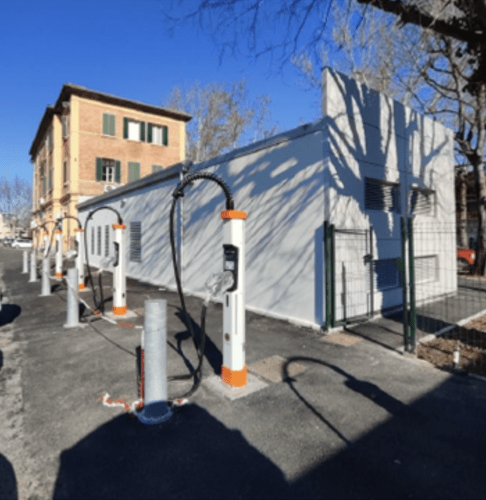 L’impianto di ricarica è composto da un charger della potenza totale un totale di 400 KW, che alimenta 6 punti di ricarica con presa standard universale CCS2 posizionata sul veicolo (max 160 KW). Il charger è un prodotto della tecnologia finlandese Kempower, azienda leader nelle soluzioni di ricarica di veicoli elettrici con realizzazioni all’avanguardia in tutto il mondo. Sul coperto del locale tecnico è installato un impianto fotovoltaico da 7,65 KW per l’alimentazione dei servizi dell’infrastruttura.