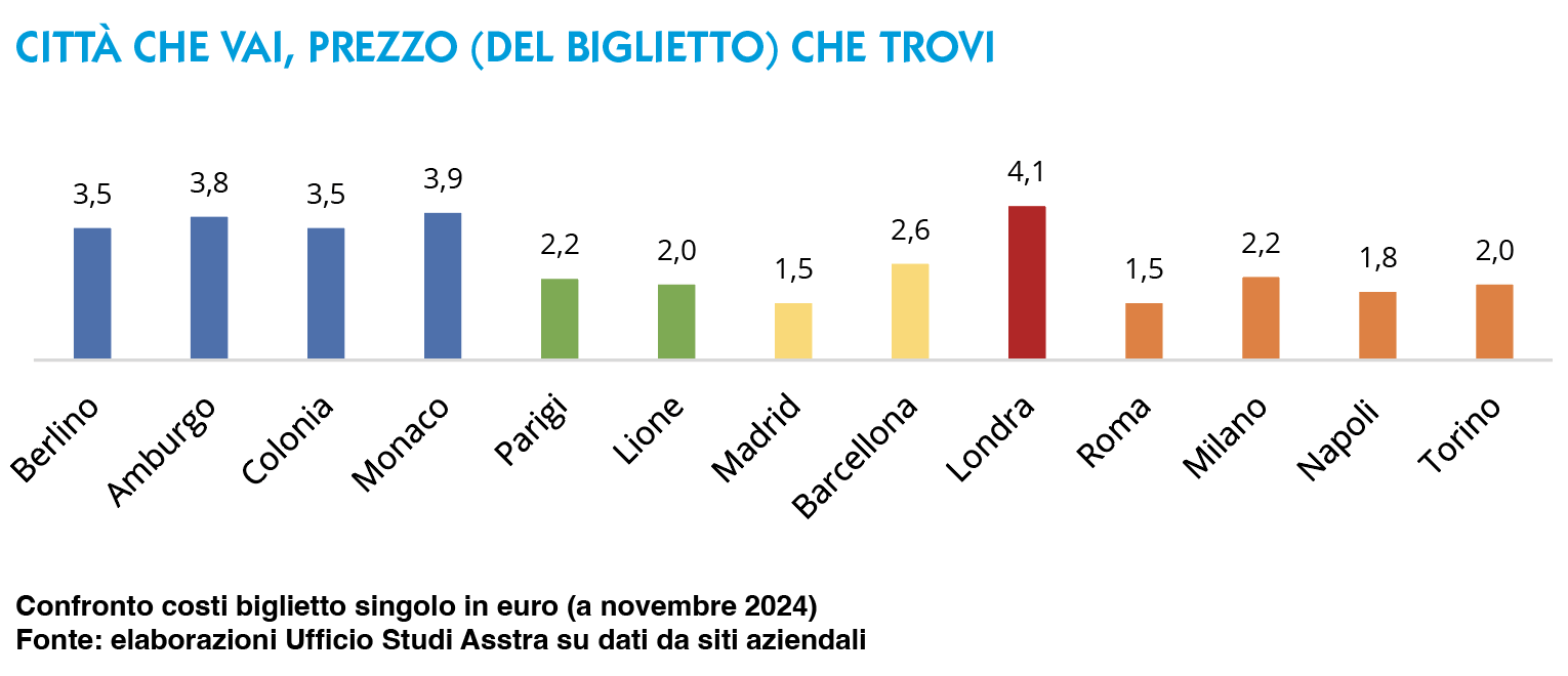 A livello europeo, è evidente come l’offerta tariffaria si presenti in maniera totalmente disomogenea. L’analisi sul biglietto singolo, riferita a novembre 2024, fa posizionare l’Italia al quinto posto. Il costo medio, ricavato dalle principali metropoli della penisola (Roma, Milano, Napoli, Torino) è di 1,9 euro. La precede la Spagna, le cui stime si rifanno a Madrid e Barcellona, con un valore di 2 euro. Sale a 2,1 euro il costo medio del biglietto in Francia, calcolato su Parigi e Lione. La Germania, nella quale sono state prese in esame Berlino, Amburgo, Colonia e Monaco di Baviera, ha un costo medio di 3,7 euro. Mentre Londra, unica località analizzata del Regno Unito, ha una media di costo più alta, pari a 4,1 euro (con utilizzo dell’Oyster card, relativamente alla rete metropolitana zona 1-2, nelle ore di picco).