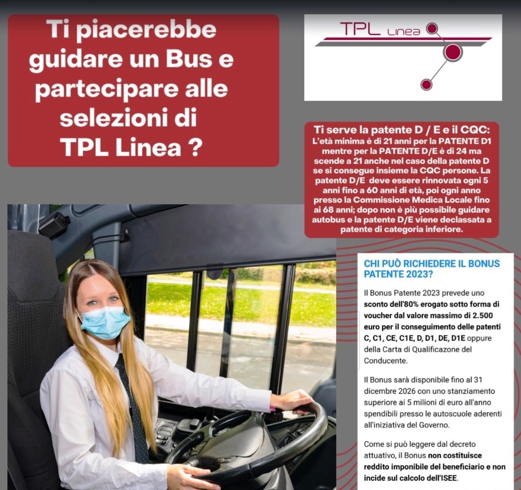 Per essere alla guida del parco mezzi di Tpl Linea è necessaria la patente D/E e la certificazione CQC-Carta di Qualificazione del Conducente. L’età minima per la patente D1 è di 21 anni, mentre per quella D/E è di 24 anni, ma scende a 21 in caso di conseguimento della D1 assieme alla qualifica CQC. La patente D/E deve essere rinnovata ogni 5 anni fino a 60 anni, poi ogni anno dopo una valutazione della commissione medica fino a 68 anni.