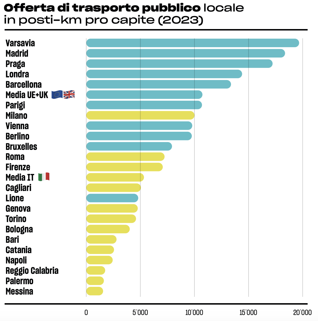Sono stati i passaggi del rapporto che potremmo condividere e per iniziare a inquadrare lo stato delle cose, iniziamo con il seguente: “In media, le città europee, da Madrid a Varsavia, hanno il doppio dell’offerta in termini di posti-km pro capite e cinque volte i chilometri di trasporto rapido di massa (metro, tram e filobus)“.