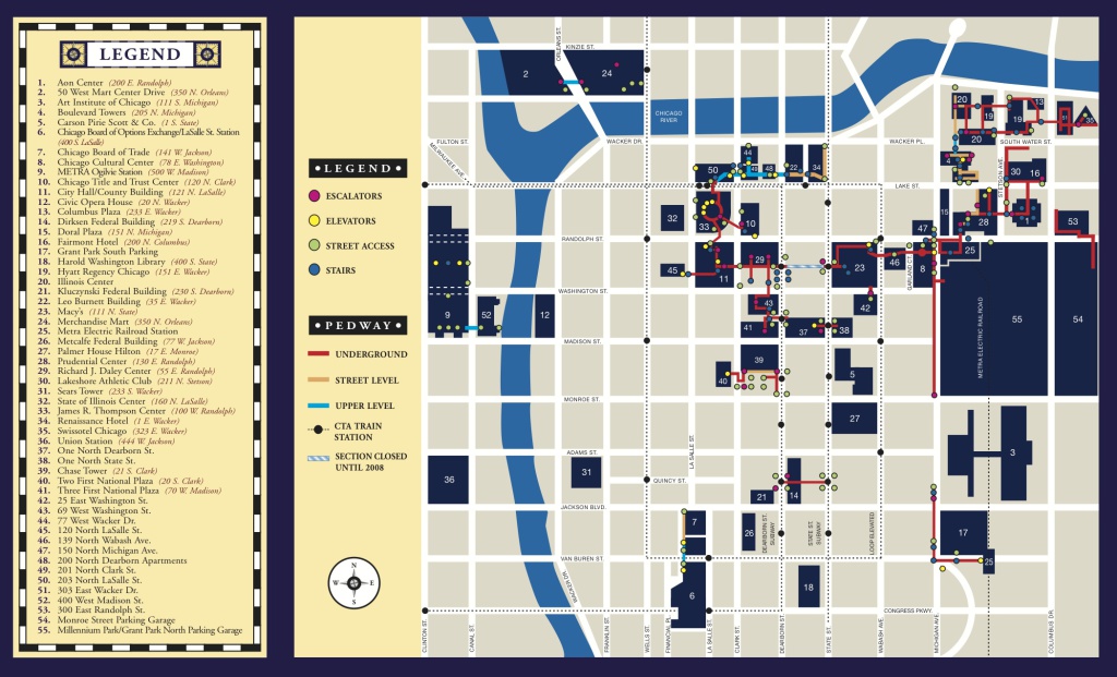 Per i più freddolosi — e a Chicago d’inverno fa molto freddo, con temperature fino ai -30° — sono stati sviluppati in città dei percorsi pedonali coperti che collegano edifici pubblici, hotel, stazioni della metropolitana e centri commerciali chiamati pedways. Un po’ sotto terra, un po’ a livello strada e un po’ sopraelevati, i pedways si estendono per ben oltre 20 km nel centro della città, e permettono a tutti i chicagoans di scendere dalla metropolitana ed arrivare al lavoro senza bagnarsi o congelare all’aria aperta. Noi ovviamente li abbiamo percorsi tutti!