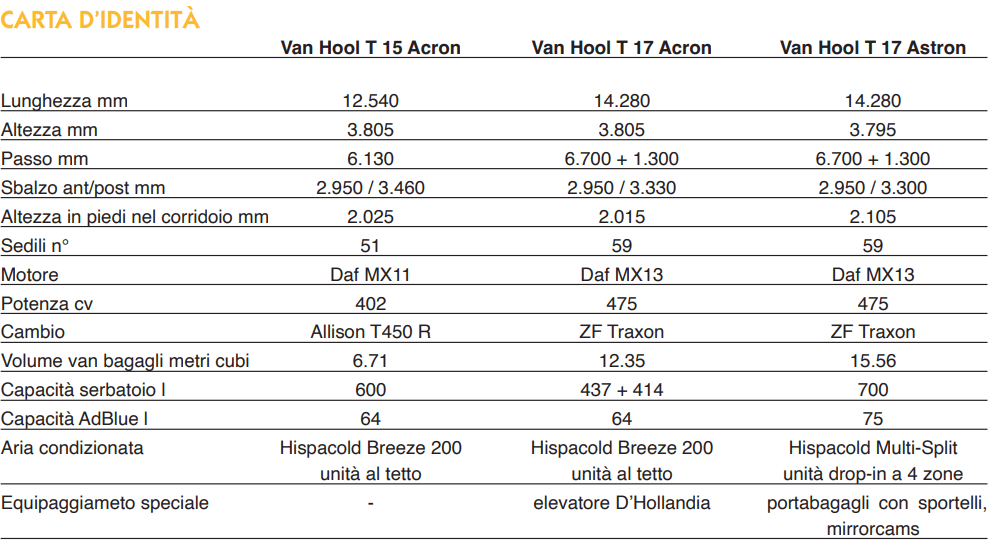 L’importanza del fattore ‘T’. ‘T’ come tempo e tradizione, che sono dalla parte di un’azienda familiare come Van Hool, presente sul mercato da settantacinque anni. E ‘T’, anche, come turismo: alle nostre latitudini, infatti, i coach made in Belgio viaggiano spesso e volentieri in coppia con la livrea del picchio di MarinoBus, in versione bipiano. Ora, al tramonto di un anno positivo dopo un biennio assai negativo segnato della pandemia, il costruttore belga rinnova il proprio listino lanciando la serie T, che inizierà a macinare chilometri in strada da aprile 2023. Parola dell’amministratore delegato FIlip Van Hool. E che affiancherà i granturismo di lusso, Ex e Tdx. Ecco allora gli eleganti e arrotondati modelli Alicron (2 assi), Acron (2 e 3 assi) e Astron (3 assi), spinti da motore Daf generazione Euro VI Ng da 11 e 13 litri con una gamma di potenza che va da 367 a 530 cavalli. Trasmissione? La scelta è tra automatizzati (ZF TraXon) e automatici (ZF EcoLife e Allison). Capienza? Fino a un massimo di 59 persone. Lo sviluppo della serie Van Hool T è stato dominato da quattro temi: aerodinamica, design, comfort e sicurezza. Vediamole nel dettaglio. (Nella tabella