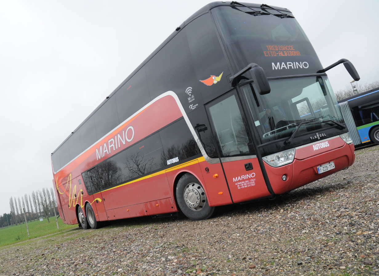 Già un Van Hool Astromega da 14 metri non passa inosservato; se poi è verniciato di rosso e sulla fiancata è scritto Marino, la cosa è ancora più interessante. Si, perché con questo acquisto la Marino di Altamura (in provincia di Bari) ‘tradisce’ il marchio Setra, finora presente su tutti, o quasi, i novanta autobus da noleggio e da superlinea che costituiscono una delle flotte più giovani d’Italia. Non è dato conoscere la reale motivazione di questa scelta ed in questa fase non ci interessa molto, ma la novità ci spinge a descrivere uno dei più completi autobus a due piani disponibili oggi sul mercato.