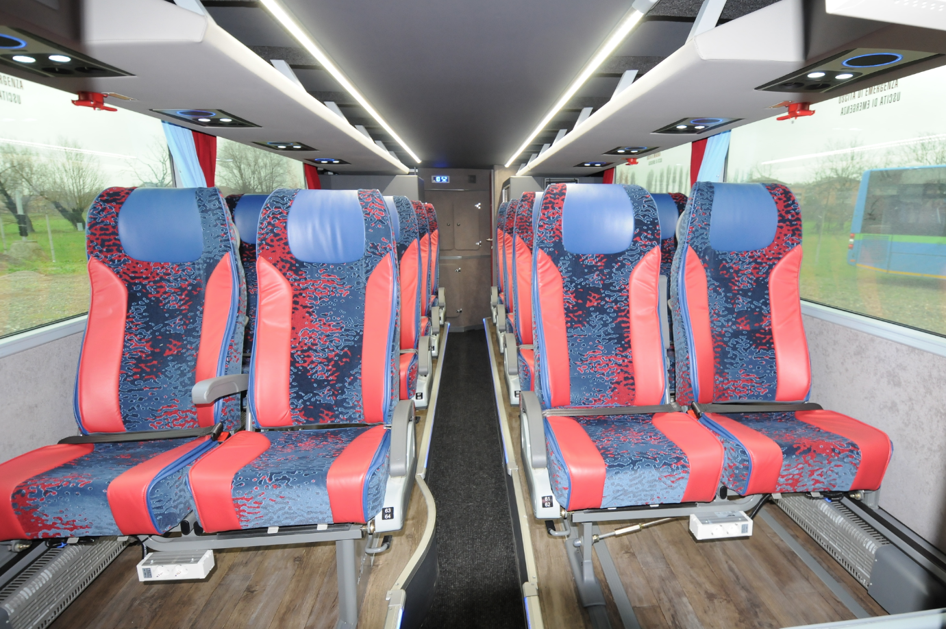 I rivestimenti interni del soffitto e delle pareti sono realizzati in velluto a tinta unita di colore grigio che contribuiscono ad un tocco di eleganza senza rendere troppo cupo l’abitacolo. L’illuminazione interna è completamente a led, sia quella centrale a bordo cappelliera, sia i faretti individuali. Durante il viaggio, per chi non volesse riposare è a disposizione, sotto ogni biposto, una presa elettrica a 220 volt per alimentare il proprio computer portatile, il quale può collegarsi alla rete wifi di bordo.