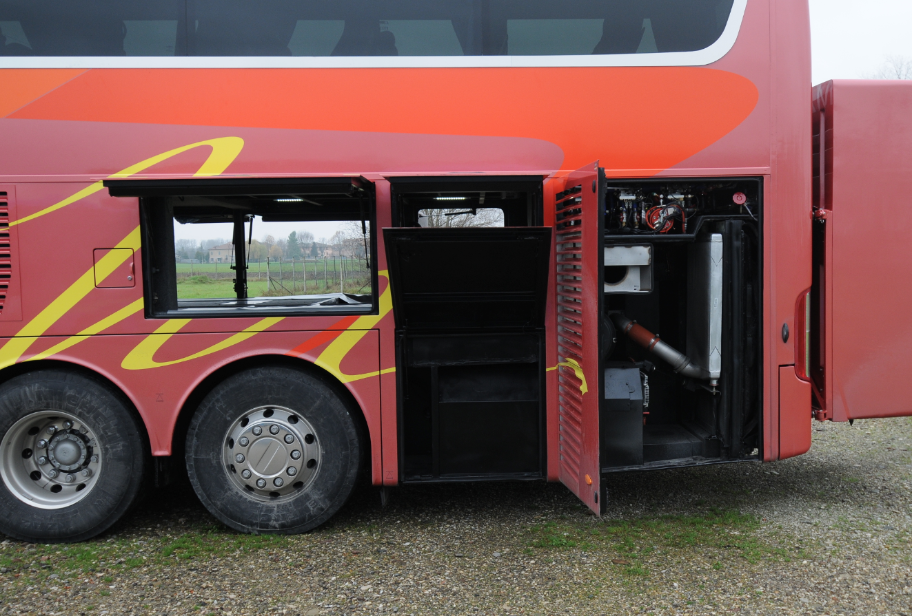A spingere i 15 metri scarsi del Tdx27 (incluso il portasci) ci pensa la ormai tradizionale meccanica Daf, con il Mx13 da 510 cavalli cui è abbinato lo Zf As-tronic dotato, contrariamente ai concorrenti, di comando a cloche. Gli assali Zf sono a ruote indipendenti sia sull’anteriore che sul terzo trainato, che è anche sterzante con controllo idraulico. L’assetto viene gestito da un impianto pneumatico a controllo elettronico Ecas con ammortizzatori Fsd in grado di distinguere le sollecitazioni di carico da quelle dovute alle irregolarità della superficie stradale. L’impianto frenante con Abs ed Asr include l’ormai obbligatorio dispositivo di controllo della stabilità Esc.