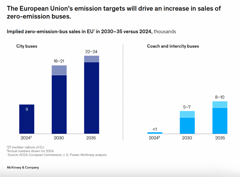 Le vendite annuali di autobus a zero emissioni in Europa arriveranno a 21.000 unità entro il 2030, secondo uno studio McKinsey