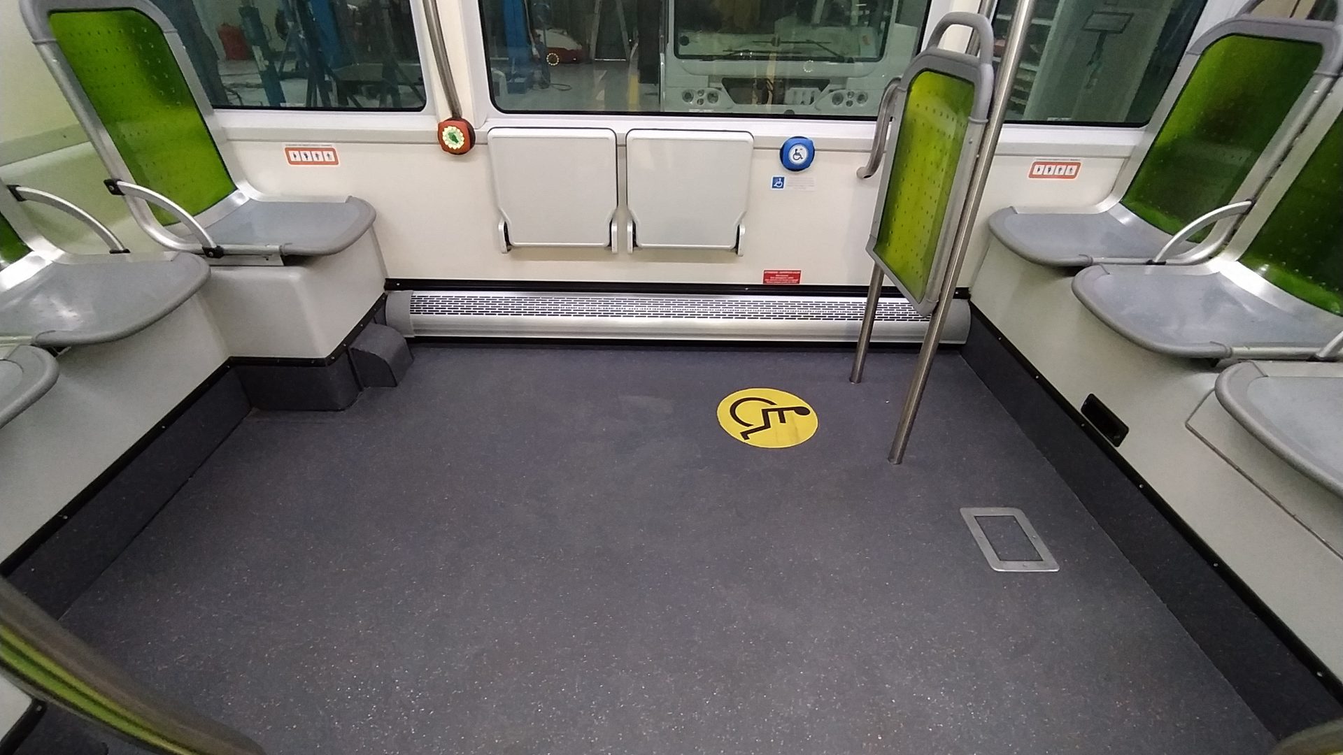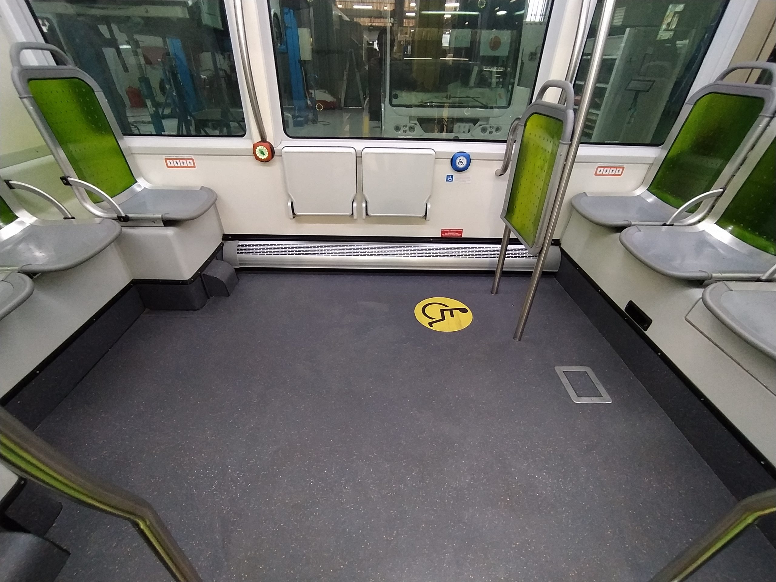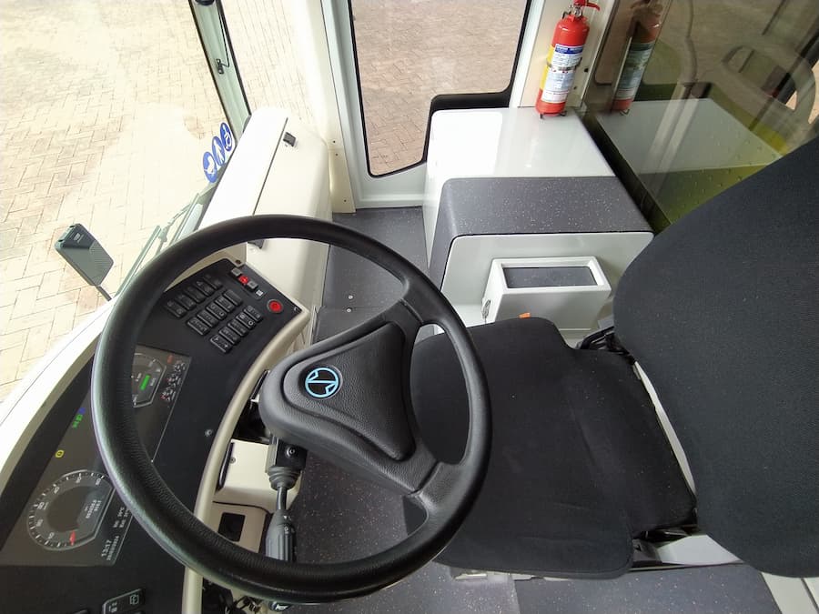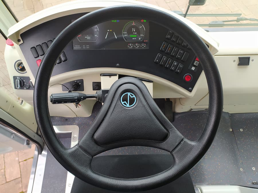 La carrozzeria è realizzata interamente in vetro-resina. L’incarrozzamento a bordo avviene tramite doppia porta centrale a soffietto realizzata in-house e la salita e la discesa delle persone con disabilità è agevolata da una pedana automatica e intelligente– integrata nel telaio (realizzato da un fornitore esterno su dima fatta in casa, ovviamente!) – firmata Hübner: ha un sistema di blocco automatico in caso di eventuale contatto con un ostacolo. Nonostante le dimensioni ridotte, lo spazio a bordo è sorprendentemente ampio: l’allestimento standard prevede 8 posti a sedere, due strapuntini e l’area riservata a una carrozzina, per una capienza di 23 persone più il conducente (senza disabile a bordo, con strapuntini occupati, il totale dei posti sale a 25).