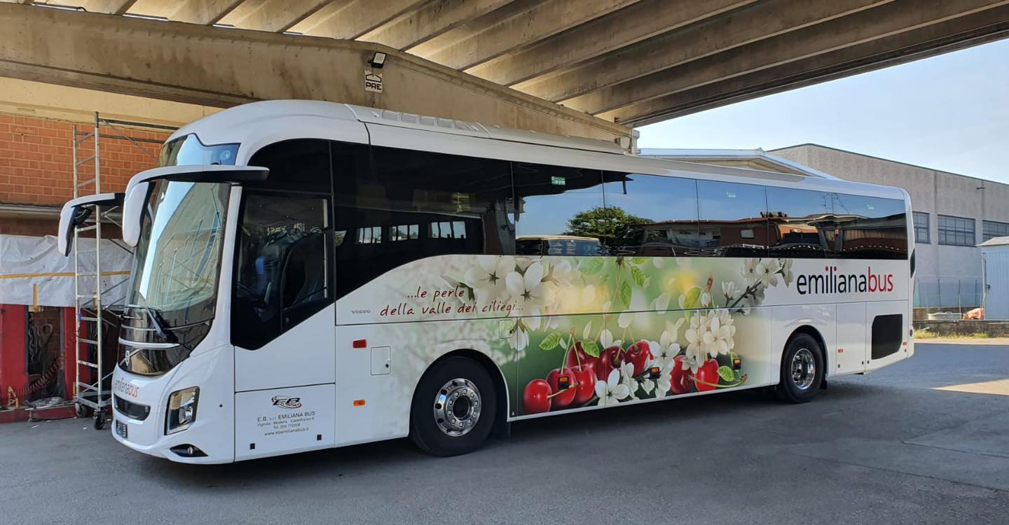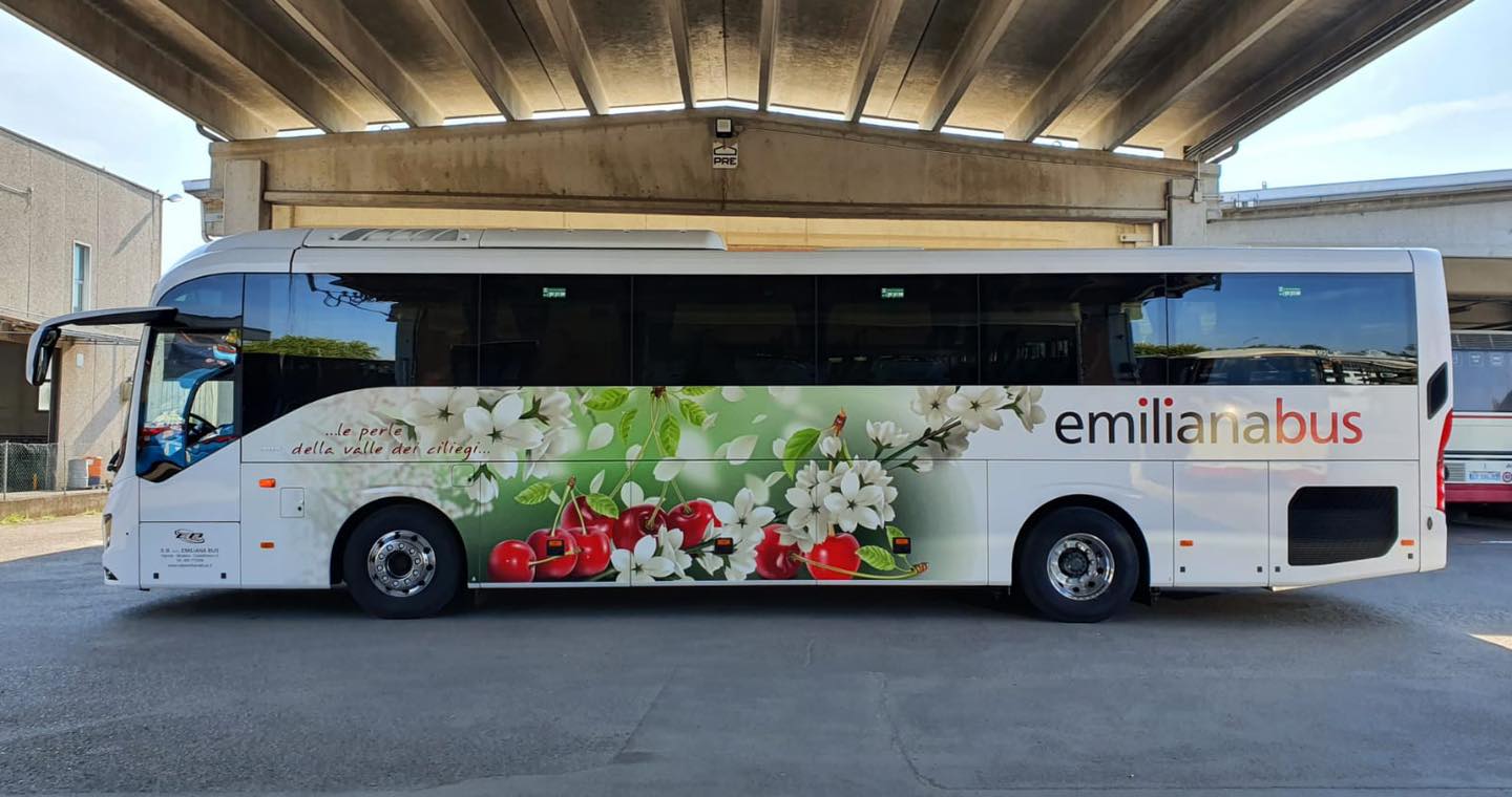 Doppia consegna Volvo: un 9900 14metri all’impresa Pettinelli, con base a Senigallia, e un 9700 (il quinto!) ad Emiliana Bus di Vignola, in Emilia-Romagna. Spicca in particolare la livrea di quest’ultimo, ispirata alle celebri ciliege (duroni) di Vignola.