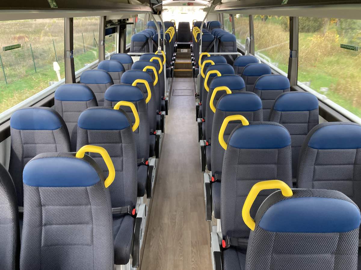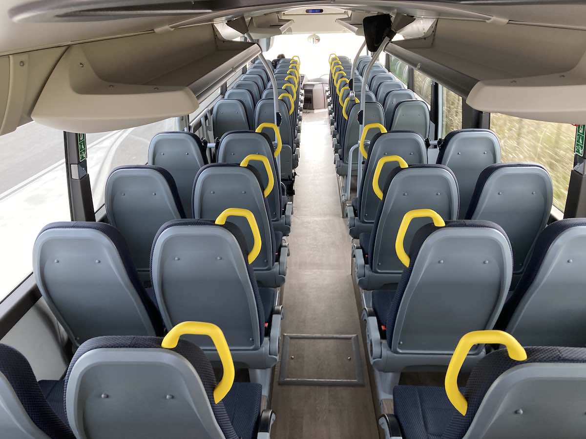 Capitolo illuminazione. Il corridoio è rischiarato da una serie di sei bande led disposte trasversalmente. Quattro i livelli di intensità previsti per la luce diurna. Tra gli optional a disposizione dei passeggeri figurano cappelliere (presenti sul mezzo esaminato in queste pagine), service set individuali provvisti di bocchettone dell’aria condizionata e luce di lettura led, pulsanti di richiesta di fermata integrati nei canali dell’aria e collocati sopra ogni coppia di sedili, prese usb. La selleria è firmata Sege.Â