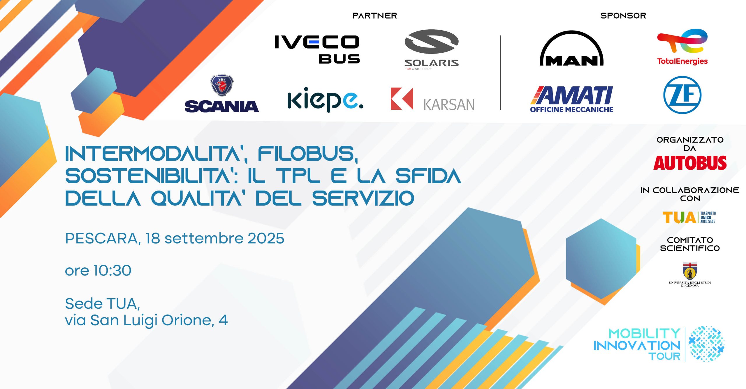 Prendete carta e penna, oppure segnatevelo con qualche “spollicata” sul calendario del telefono: giovedì 18 settembre, a Pescara, presso la sede di TUA Abruzzo, in via Via San Luigi Orione 4, a partire dalle 10:30, andrà in scena un nuovo appuntamento del Mobility Innovation Tour dal titolo “Intermodalità, filobus, sostenibilità: il tpl e la sfida della qualità del servizio“.