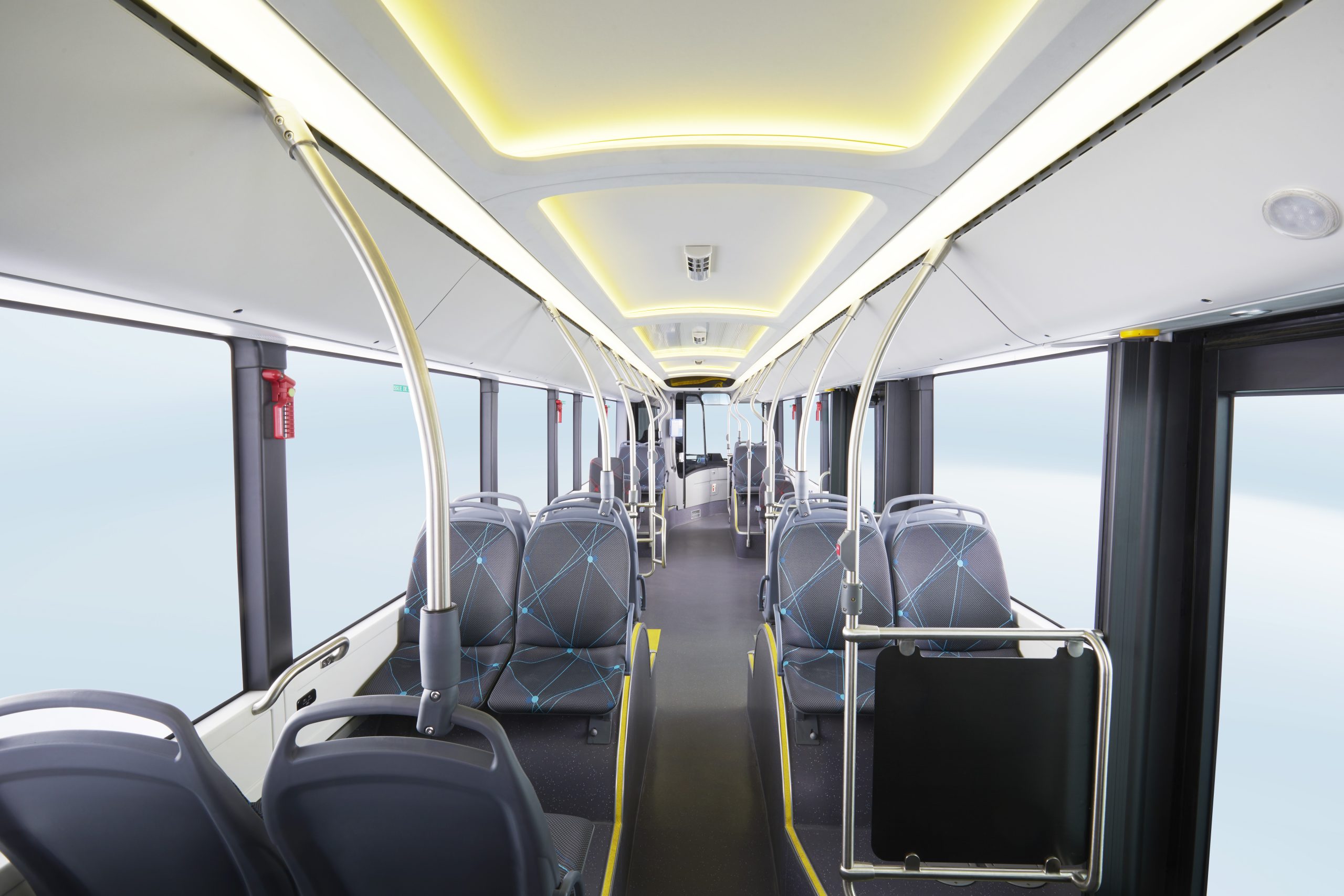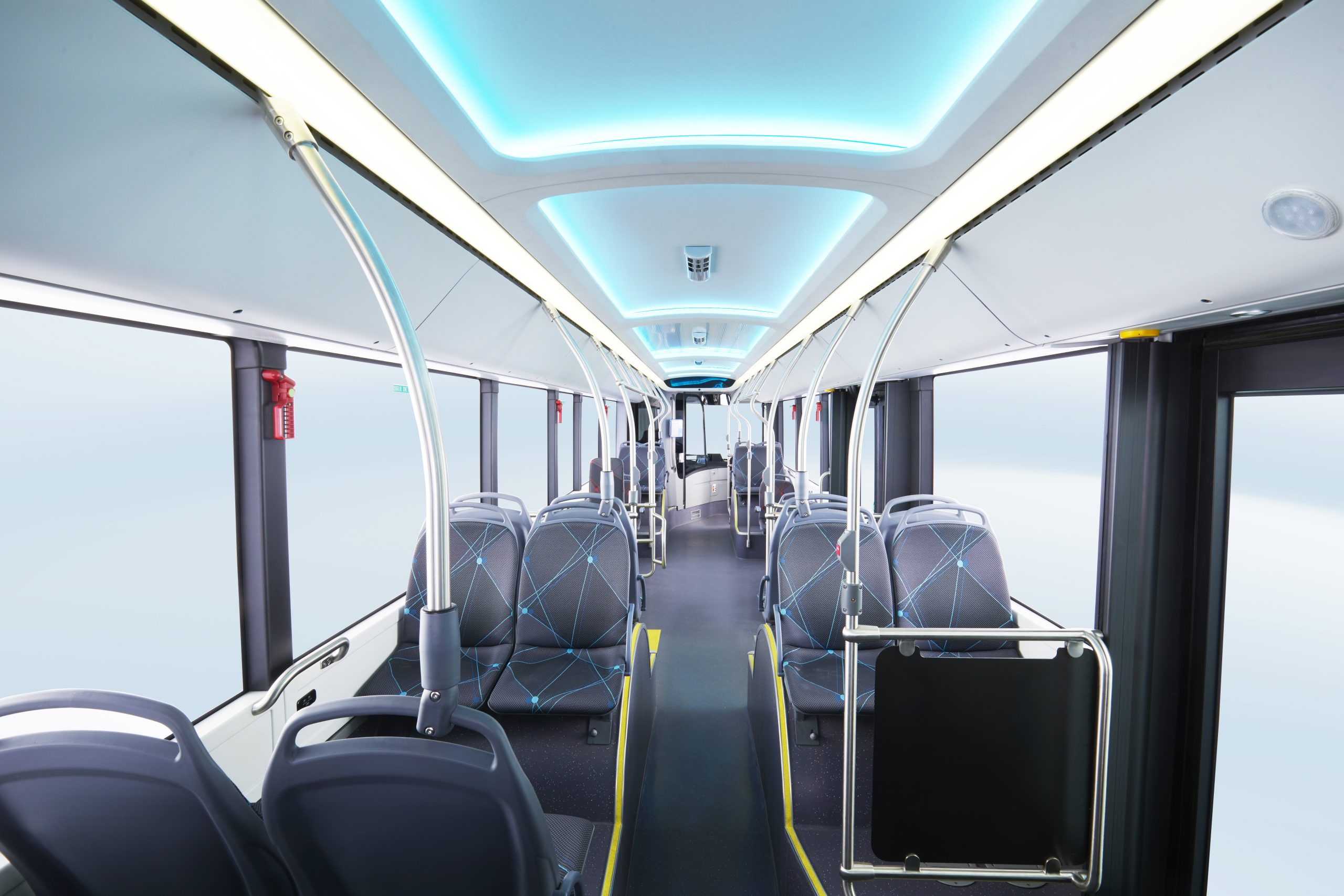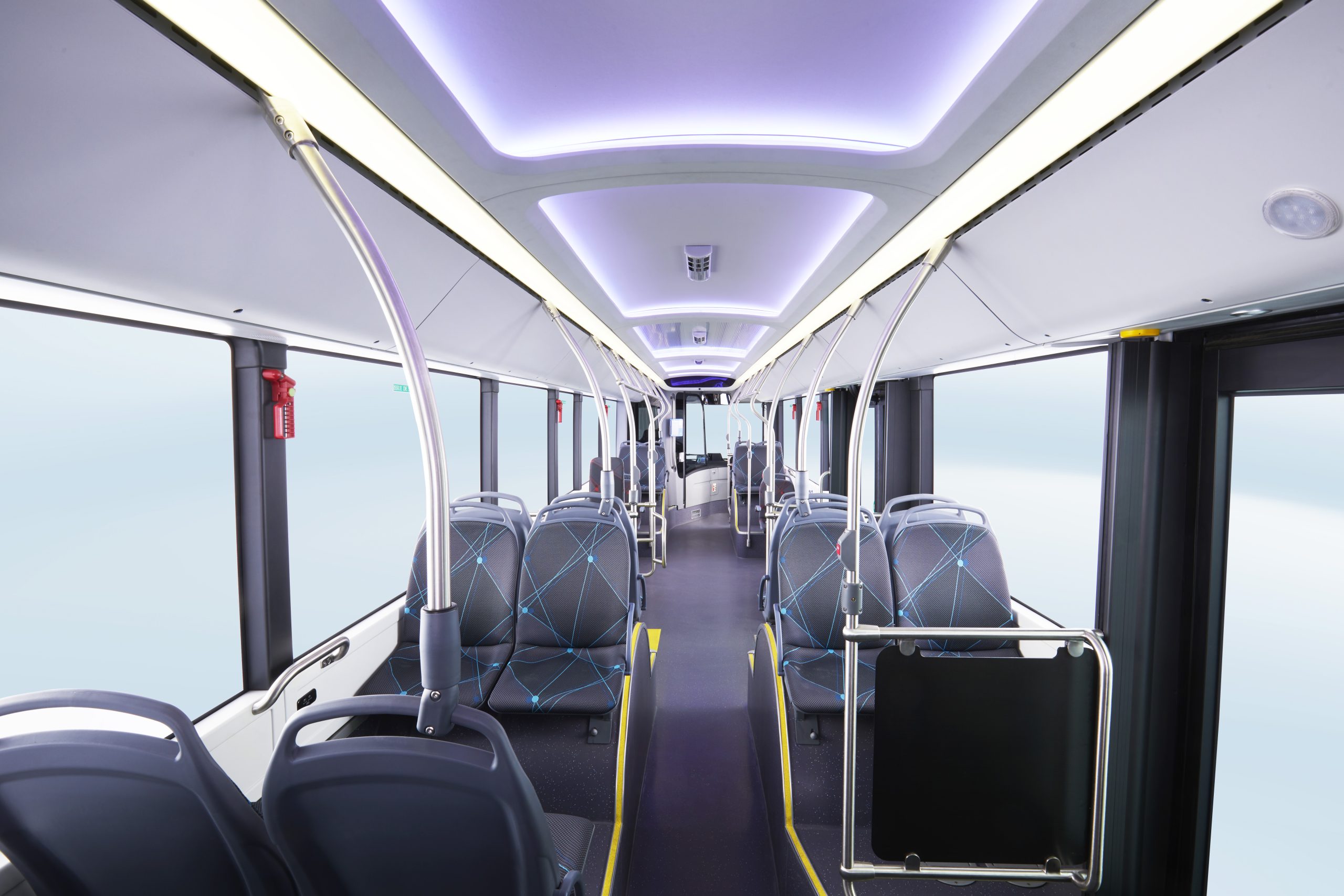 L’interno, alto 2.30 metri, è illuminato da luci ambientali a tre colori che concorrono a creare un’esperienza di viaggio e di guida piacevole e confortevole. Il soffitto dell’e-bus è ricoperto da ampi pannelli senza l’utilizzo di strisce di giunzione; la griglia dell’aria condizionata è integrata nel pannello del soffitto, così da dare rendere il tutto più armonico; le parti decorative non hanno chiodi a vista e braccioli, sedili e radiatori non sono progettati per toccare il suolo, migliorando così la fruizione degli interni che prevedono un’area riservata alle carrozzine; 40 sono i posti a sedere, mentre la capacità massima di carico è di 80 passeggeri.