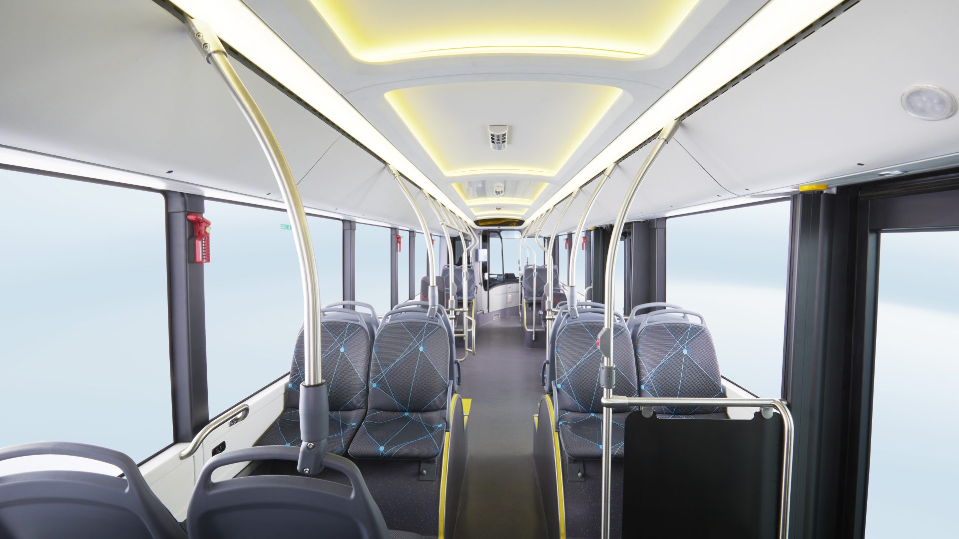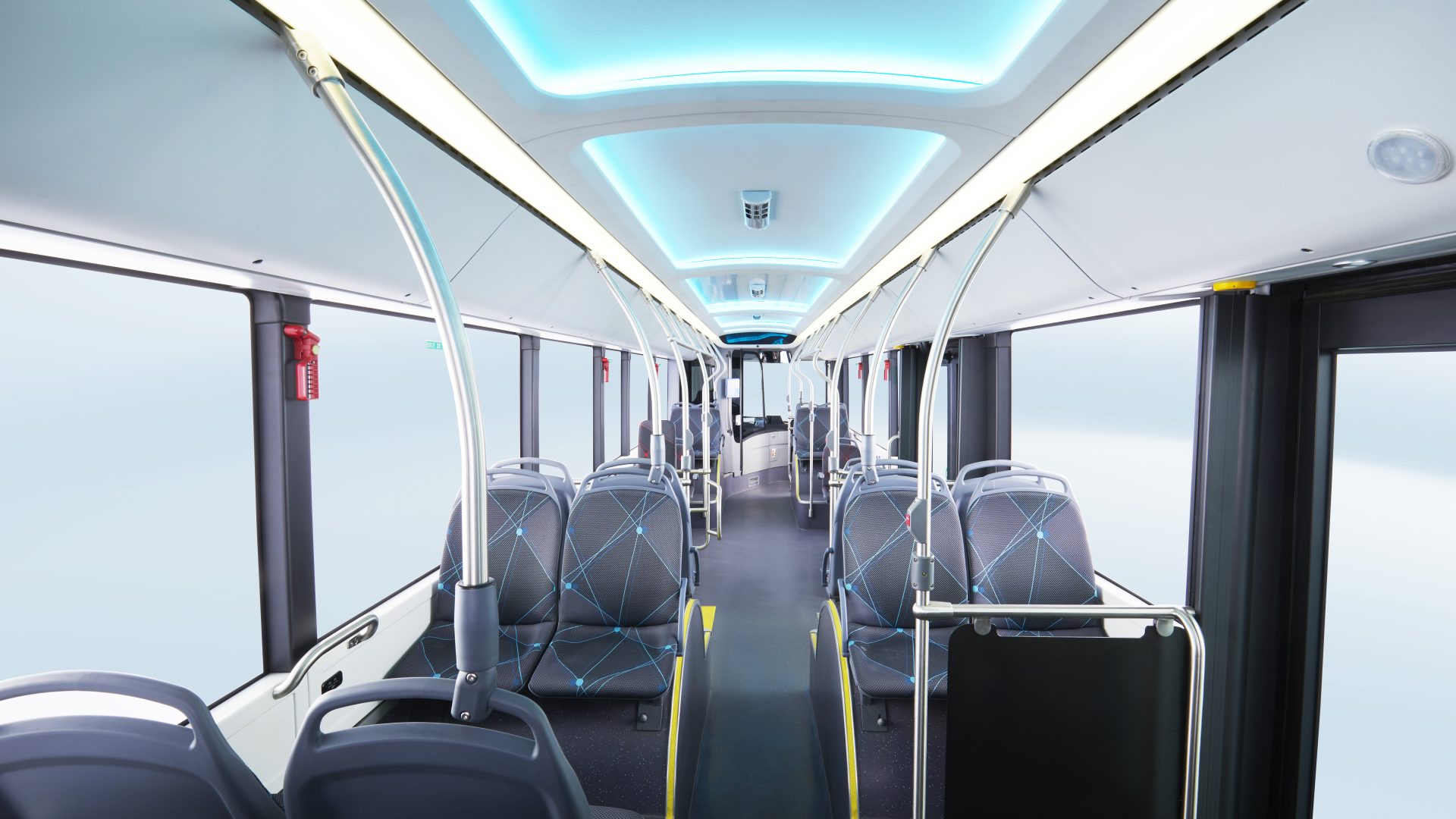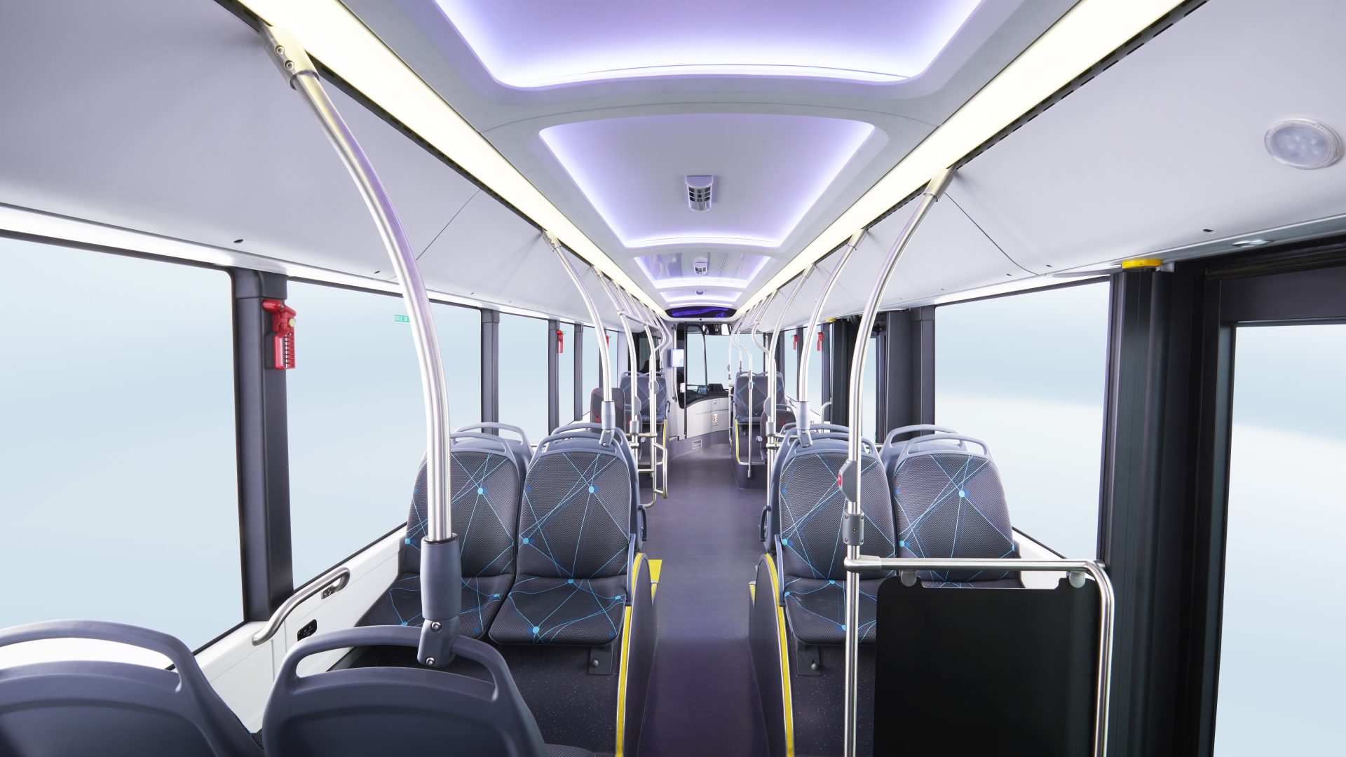L’interno, alto 2.30 metri, è illuminato da luci ambientali a tre colori che concorrono a creare un’esperienza di viaggio e di guida piacevole e confortevole. Il soffitto dell’e-bus è ricoperto da ampi pannelli senza l’utilizzo di strisce di giunzione; la griglia dell’aria condizionata è integrata nel pannello del soffitto, così da dare rendere il tutto più armonico; le parti decorative non hanno chiodi a vista e braccioli, sedili e radiatori non sono progettati per toccare il suolo, migliorando così la fruizione degli interni che prevedono un’area riservata alle carrozzine; 40 sono i posti a sedere, mentre la capacità massima di carico è di 80 passeggeri.