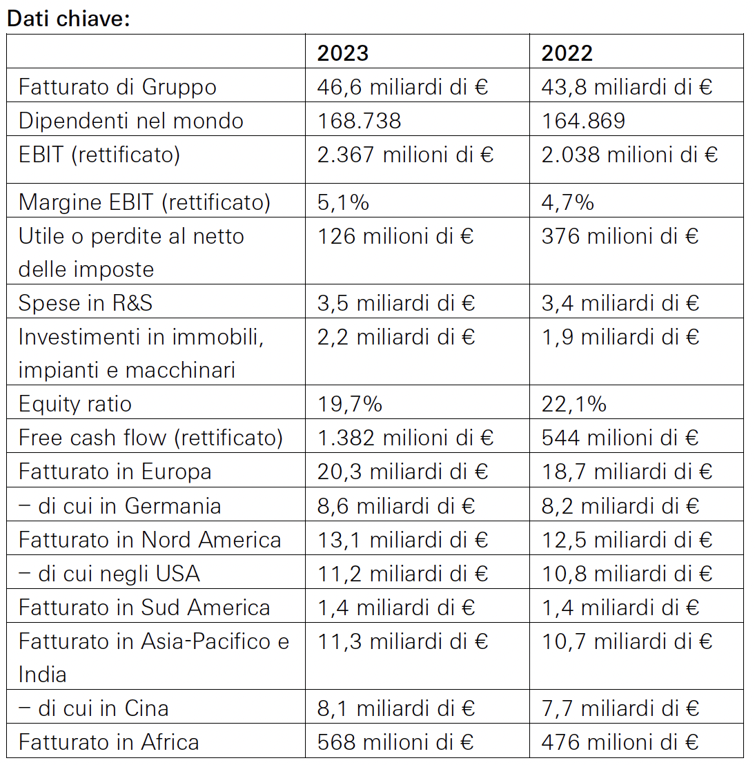 ZF ha raggiunto gli obiettivi finanziari prefissati per il 2023. Nel contesto di un’economia globale altamente volatile, l’azienda ha aumentato il fatturato del 6,5 per cento, raggiungendo i 46,6 miliardi di euro (2022: 43,8 miliardi di euro). L’EBIT rettificato è di 2,4 miliardi di euro (2022: 2,0 miliardi di euro); il margine EBIT rettificato è del 5,1 per cento (2022: 4,7 per cento). Grazie all’andamento positivo del free cash flow nella seconda metà dell’anno, ZF ha rimborsato le passività per circa 2 miliardi di euro e ridotto l’indebitamento netto di 400 milioni di euro, portandolo al di sotto dei 10 miliardi di euro.